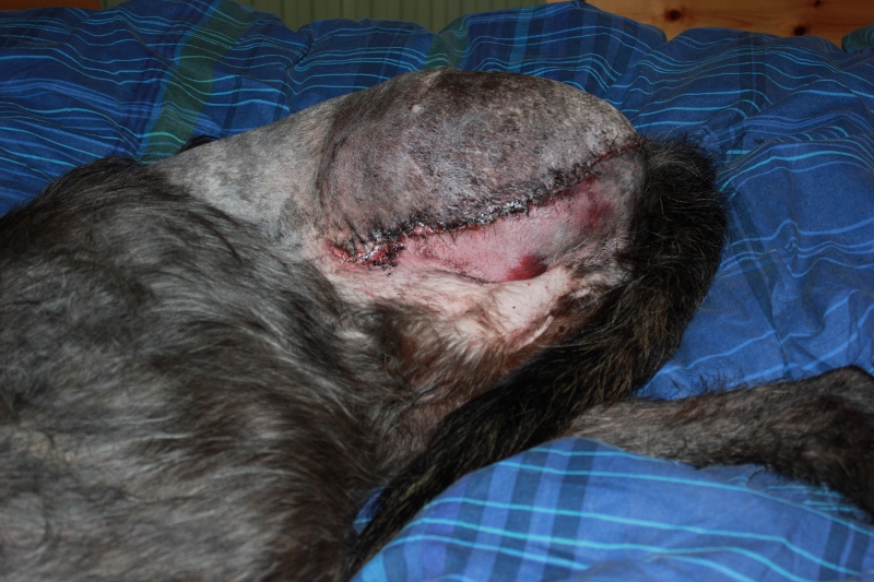 ore handy on three legs, I'm really looking forward to seeing how quickly he has what he can and can't but actually he can do everything! However, I have laid a cold, wet rag over his wound several times, it is of course a gigantic bruising and cooling does wonders. To prevent him from licking too much, I throw a large, very thin towel over him or get a cut, airy, very stretchy trouser. Rens did not get the results of the biopsies last night, so it is a osteosarcoma. Hopefully it hasn't spread yet and heals the wound quickly so that we can start with the chemo cure. Do you thumb a bit for us?