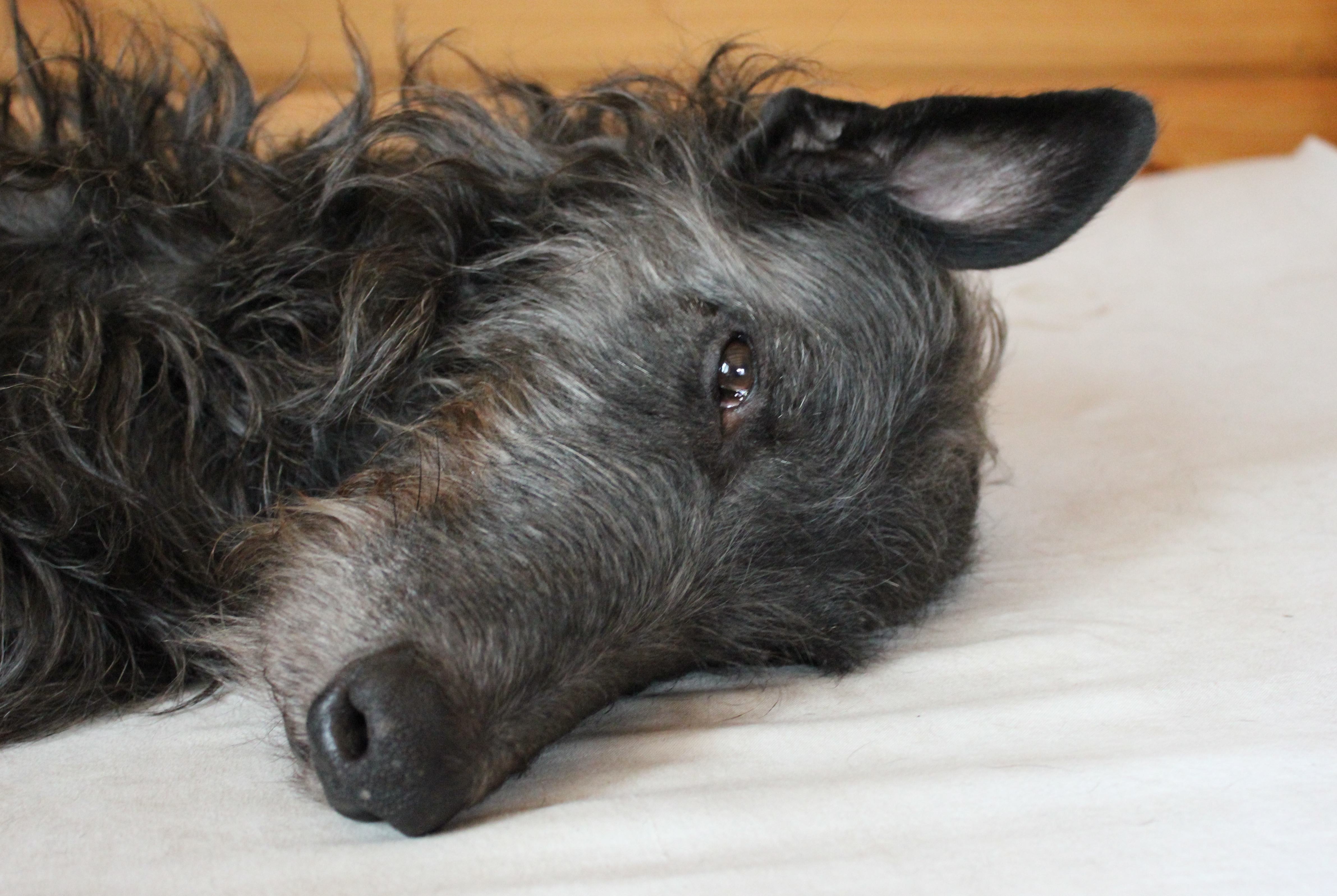 I had been given antibiotics for 5 days, so on Wednesday evening he got his last tablet. Thursday the wound looks still beautiful, not thick, not red. But in the course of the Friday afternoon, red spots began to form and the operation wound looked a bit swollen. All this time Calhoun has had no increased temperature, 37.8 was the highest! But now it was 38.8 and I made myself great worries. Of course I immediately got new antibiotics, but that night Calhoun was very restless and his temperature had risen to 39 degrees. For a Deerhound really not good. It also seemed as if he was afraid in the dark and he slept again with us on bed. On Saturday we went to the vet again and he gave Calhoun an analgesic injection and said that I could increase the Tramadol (painkiller) something. Once home, Calhoun calmed down over time. Very calm, he seemed drugged! He didn’t feel like eating that night, despite the can of tuna I had stirred through it. Fortunately he ate the most, with the medicines. I was hopeful that Calhoun would sleep well, but after an hour and a half I heard him get up and jump off his bed, he insisted on sleeping with us. By the morning he started squeaking, he didn’t need to urinate. He continued to beep, even after he had been out and had eaten with long teeth. I was at the end of the board and sent an email to Cecilia van der Drift, the animal interpreter who helped me so well with Amy. Although it is Sunday, I received a mail a few hours later that she had some time for us tonight. In the meantime, Calhoun was happily quieter and sleeping.