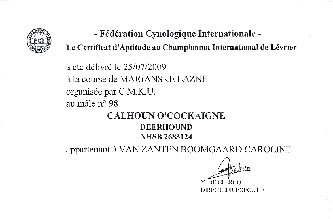 "It was further agreed to re-confirm the CACIL awarded to Calhoun O'Cockaigne, Deerhound, NHSB 2683124 at the CACIL coursing of Marianske Lazne (CZ), July 2009. The CACIL award will be sent by post to the BOM in the next days.