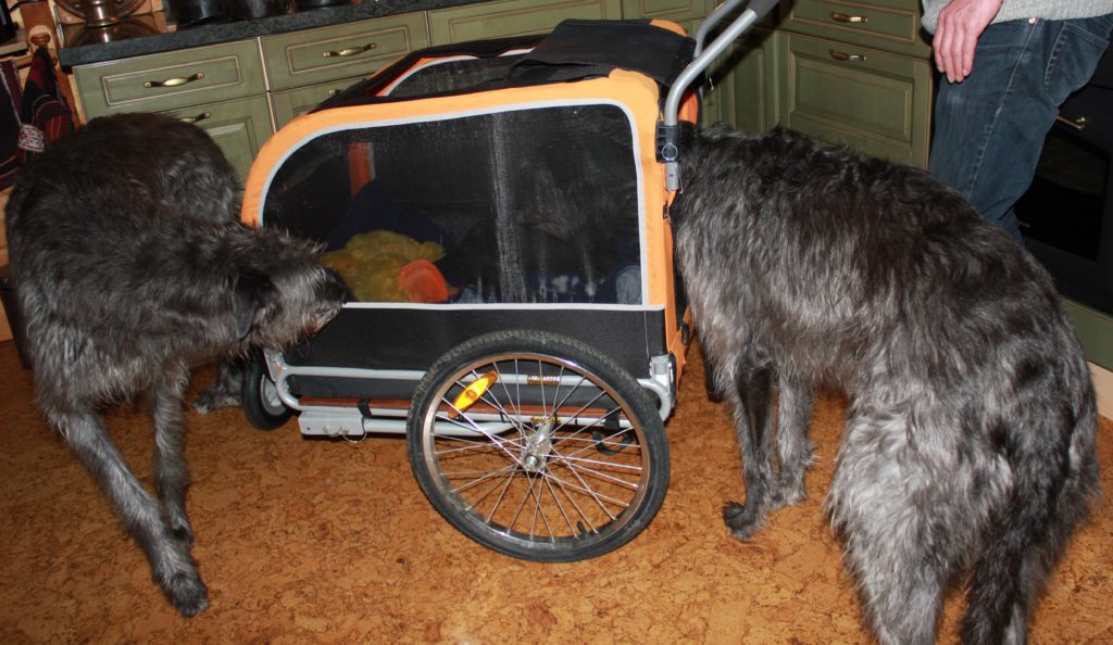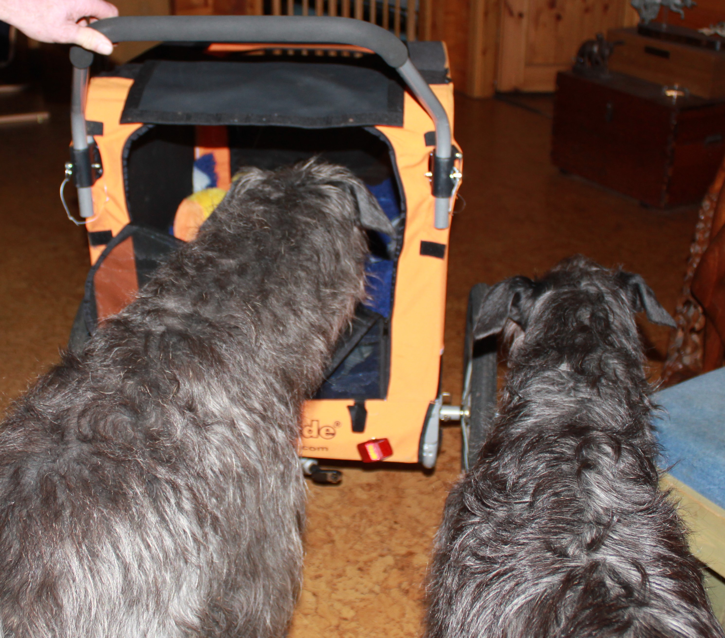 We have been able to borrow a ‘Doggy Ride’ from a friend because staying alone at home will be a problem in the short term. The day before yesterday we arranged it with blankets and a Vetbed and tried it out. Cearrean thought it was fine, he was going to play with the duck and redesign the lot. Brandir and Cytaugh found it very exciting and kept a close eye on it. Very convenient that you can go from two sides!