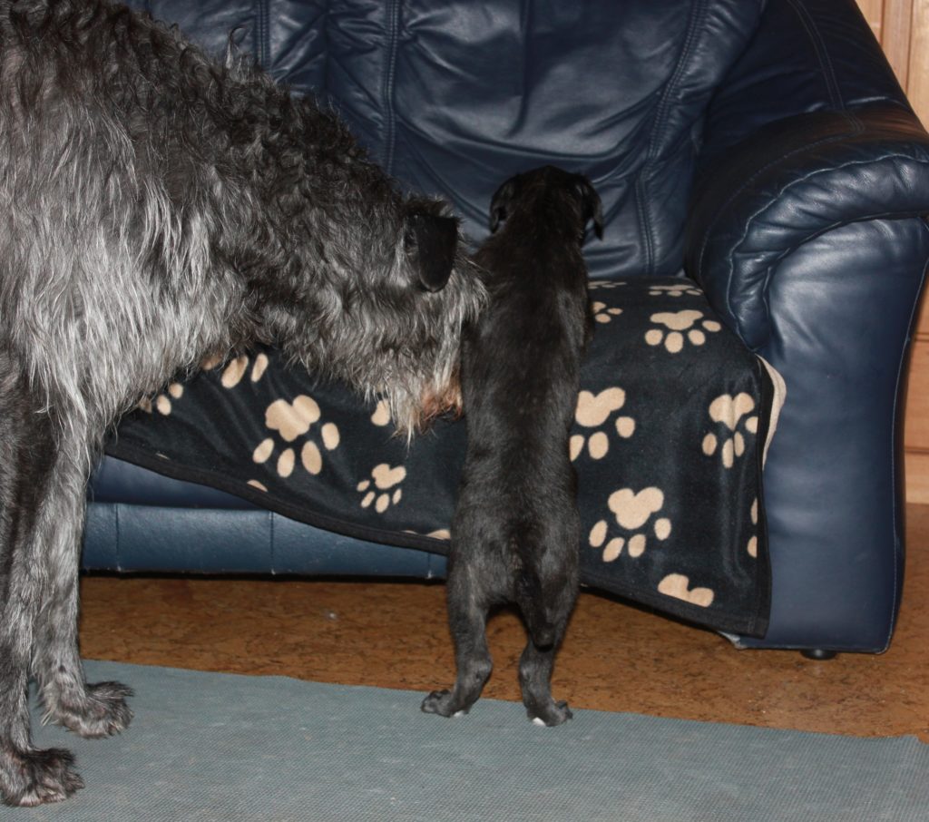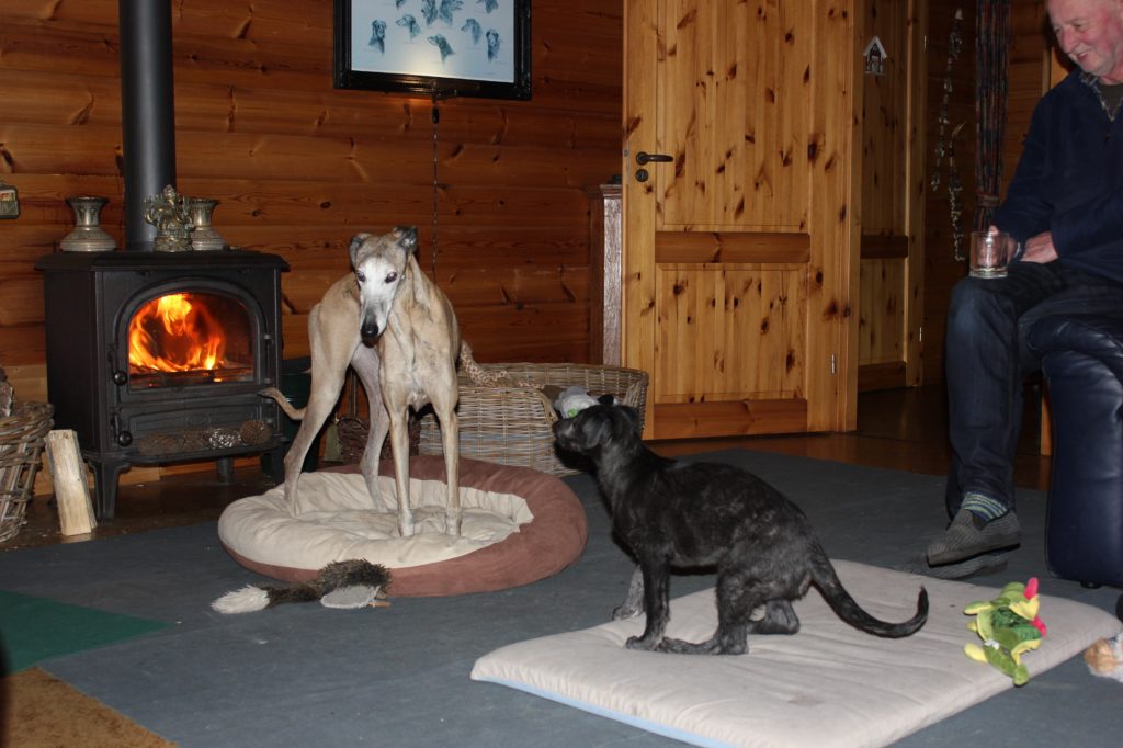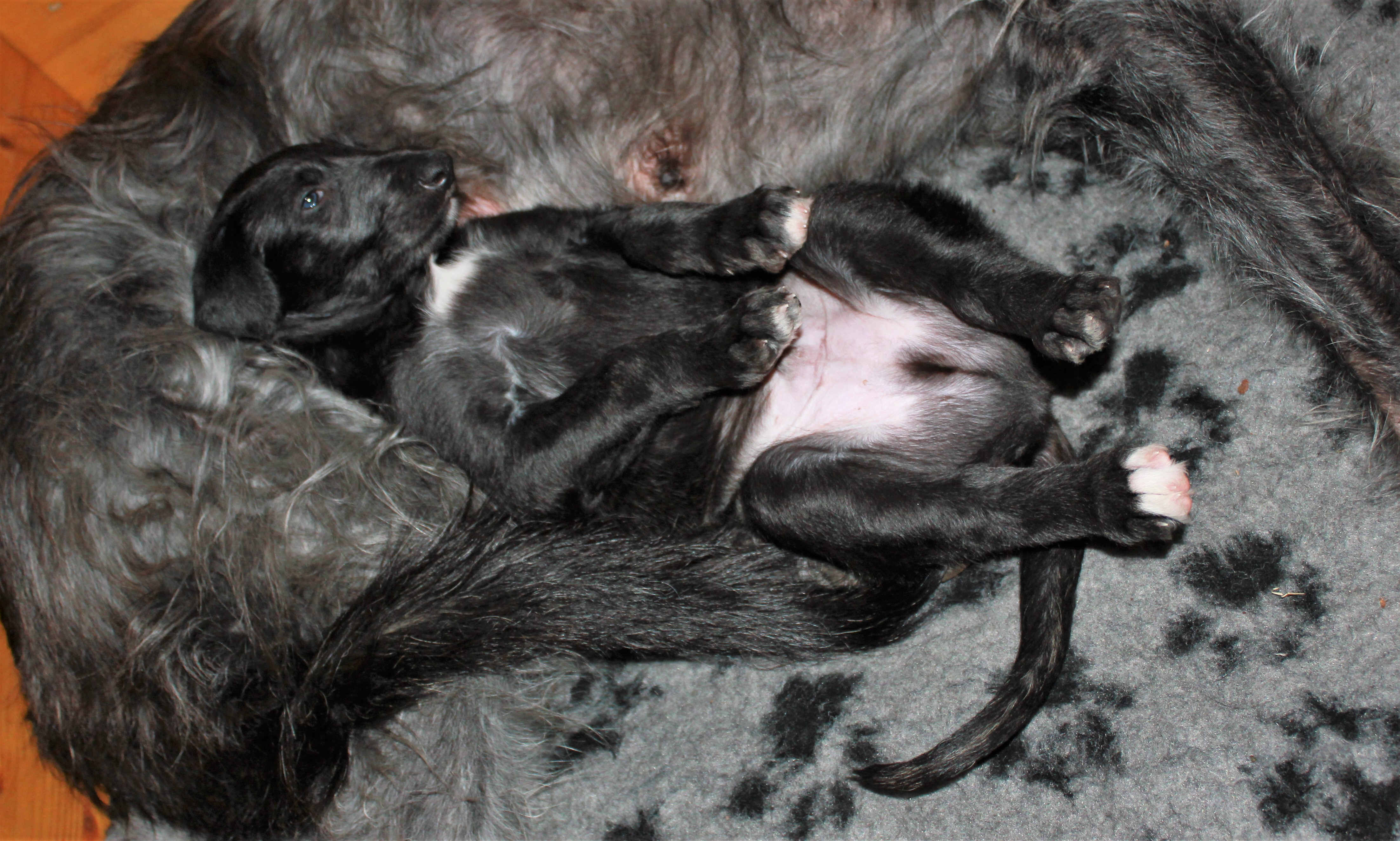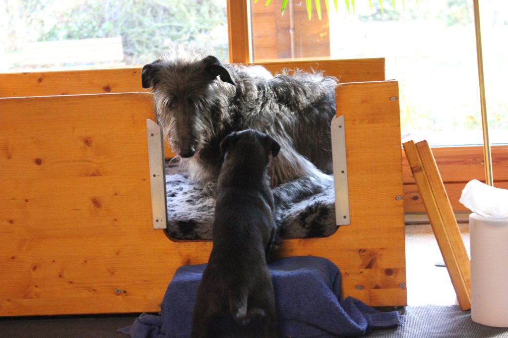 Since Lita had so many puppies, Cearrean soon knew that he could do more with her than with the others. Lita’s long tail was THE play object of course, but she also clearly indicated if it hurt her or if she didn’t want to play him. When Sonja left for the camper with the three of them in the evening, Cearrean was squeaking at the door, but when Lita came back in the morning, the first thing Cearrean did was; hang on Lita’s tail. At the end of the week, Cearrean managed to lie comfortably with her in her bed in front of the wood stove, a friend for life.