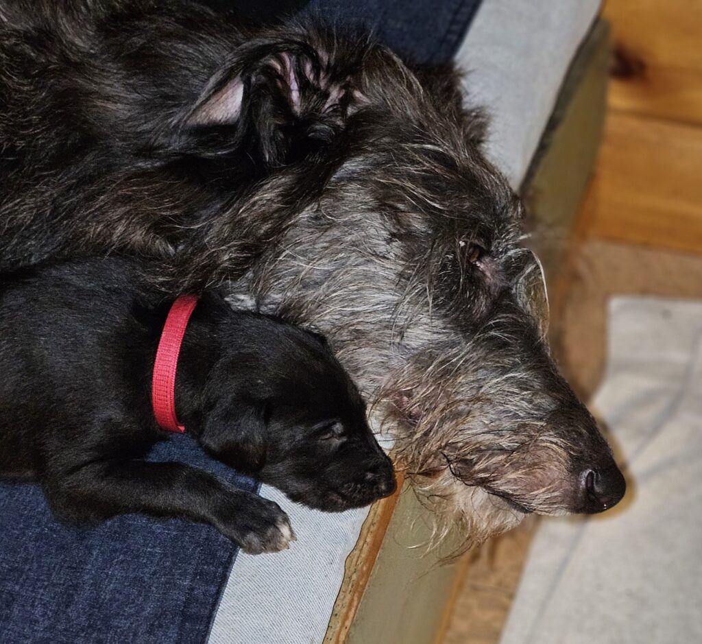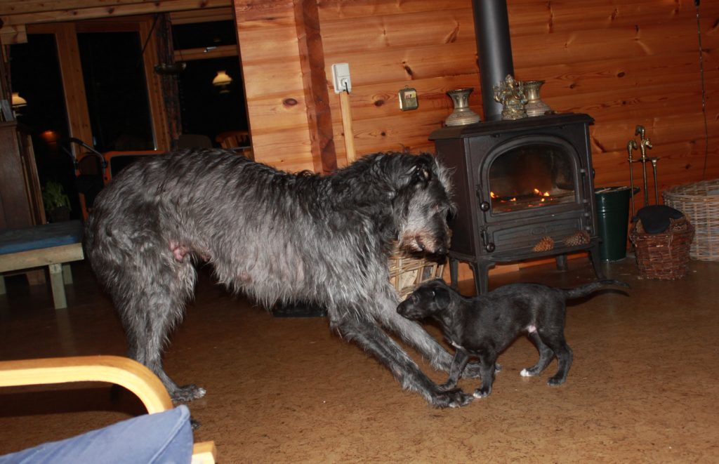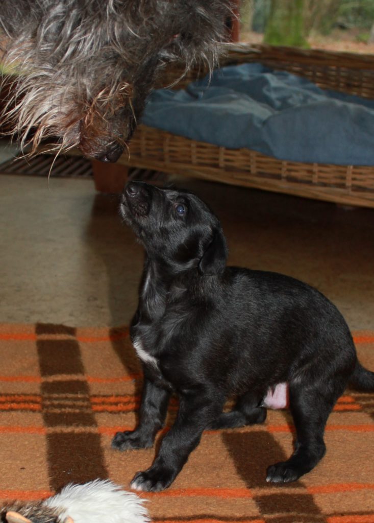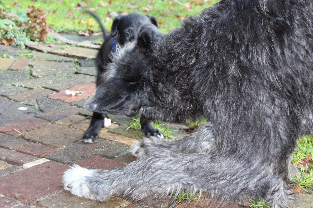 Since Lita had so many puppies, Cearrean soon knew that he could do more with her than with the others. Lita’s long tail was THE play object of course, but she also clearly indicated if it hurt her or if she didn’t want to play him. When Sonja left for the camper with the three of them in the evening, Cearrean was squeaking at the door, but when Lita came back in the morning, the first thing Cearrean did was; hang on Lita’s tail. At the end of the week, Cearrean managed to lie comfortably with her in her bed in front of the wood stove, a friend for life.