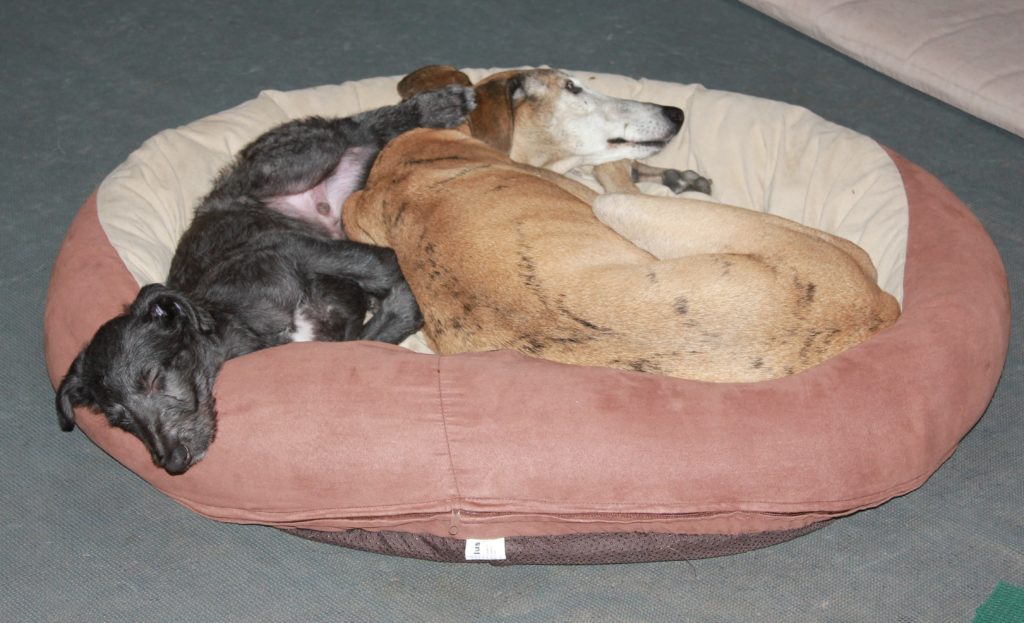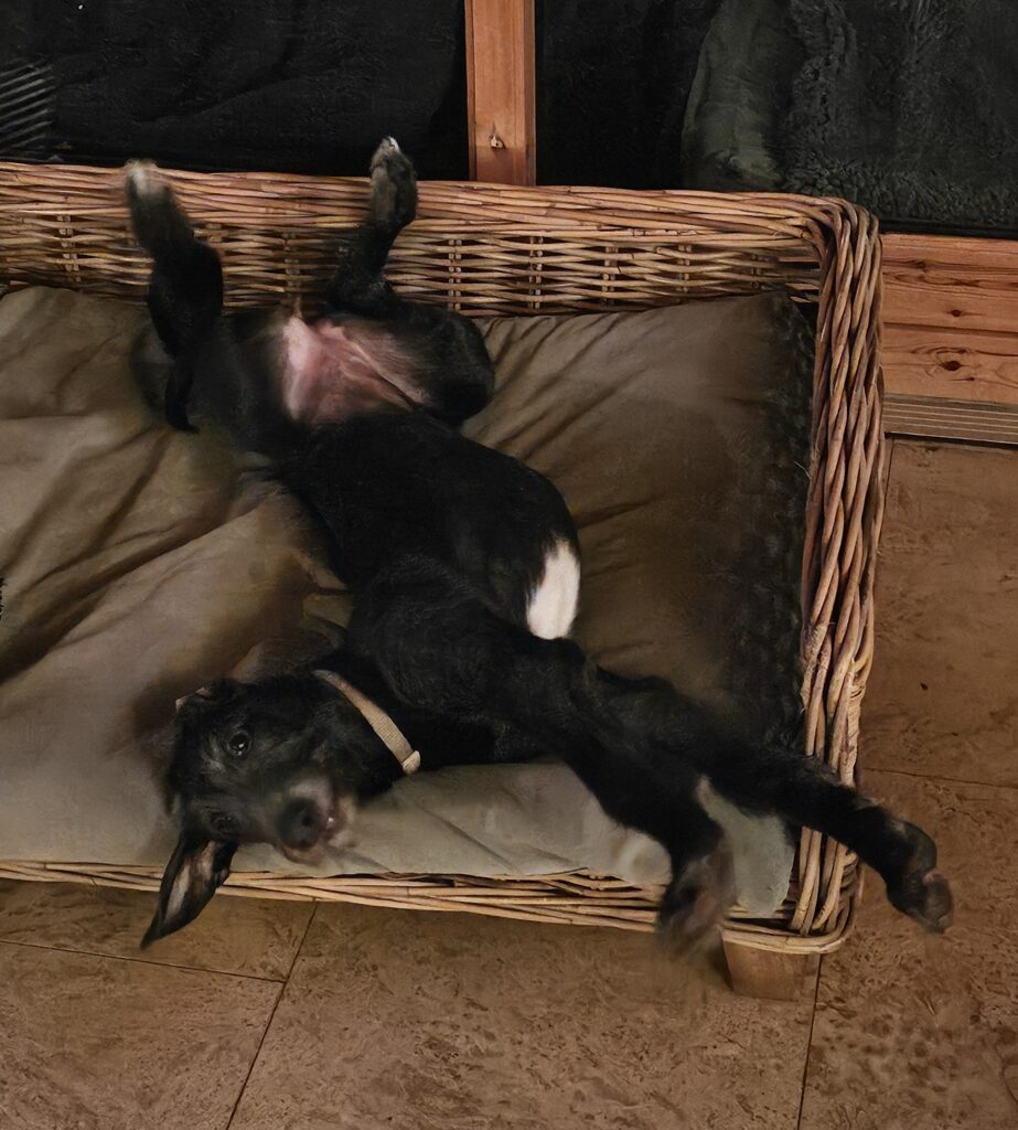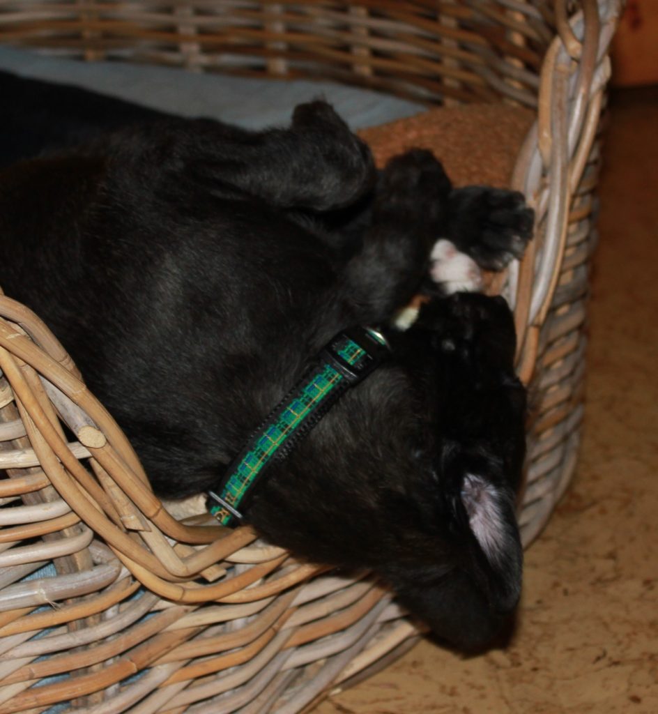 Cearrean still regularly falls out of bed. Whether it is the whelping box or the basket next to the stove, he rolls out his bed asleep at least once every two days.