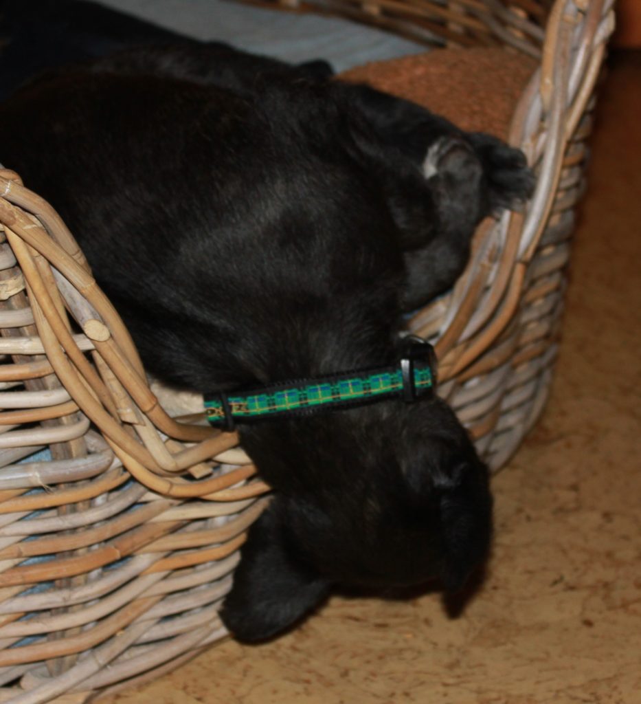 But on Saturday night, something went badly wrong! I had just returned from walking Charlaigne and was standing with my back to and next to the crate with puppies, when suddenly a huge scream came from the crate. I looked and snatched out two puppies, one of which had a paw stuck in the collar of another. Luckily, a good pair of scissors was within reach but I couldn’t get the strap cut. The puppies screamed like mad, Charlaigne all panicked and the other hounds came running too. I yelled at Simon, who was asleep, to come and help because holding two struggling puppies and cutting a strap with a big pair of scissors ……..