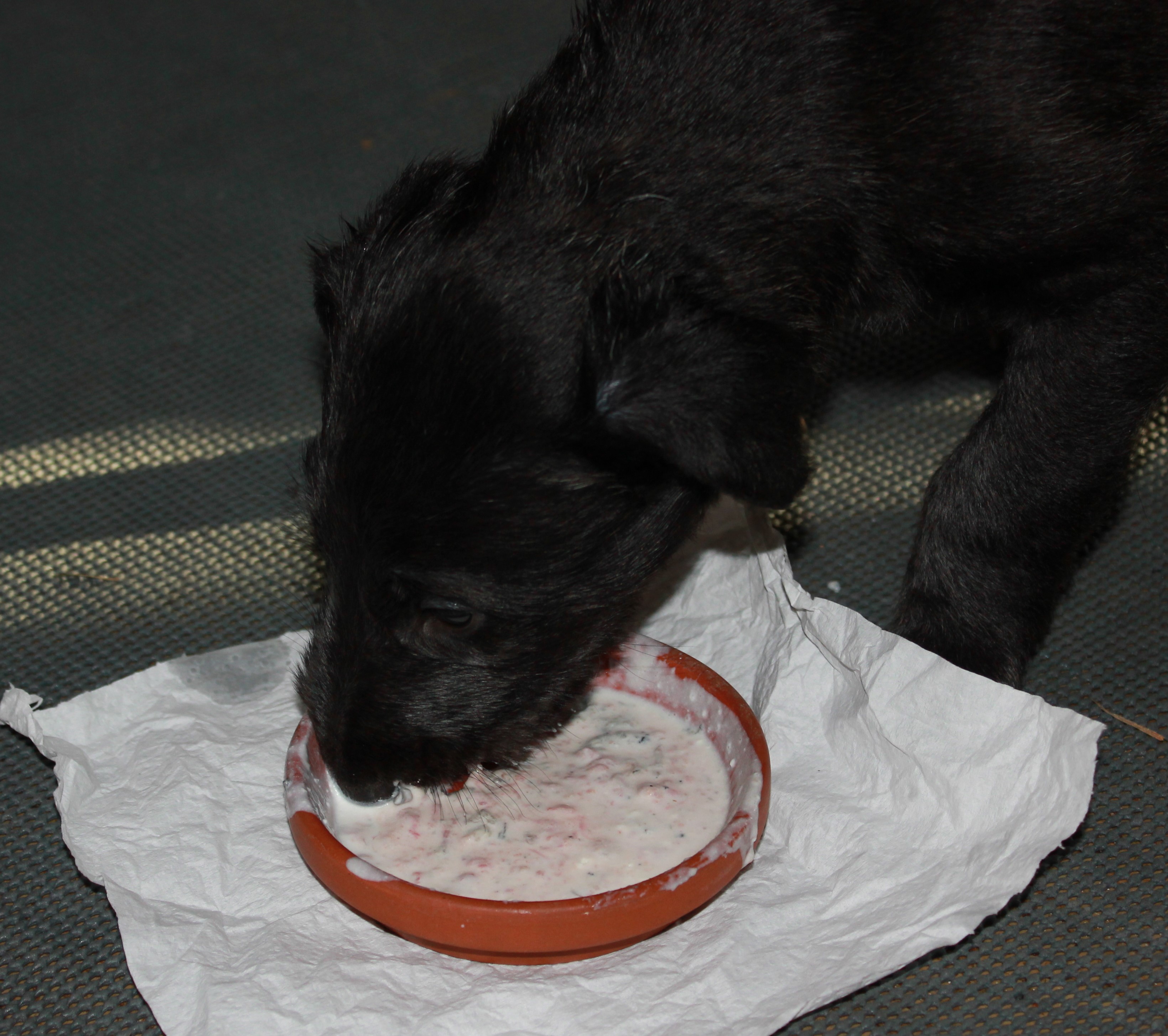 some puppy milk with steak tartare from a bowl, but also regularly eat small balls of tartare. This is fun to do, they sit next to each other and take turns to get a ball. When they have enough, Callaghan usually before Cranston, they get up and start playing.