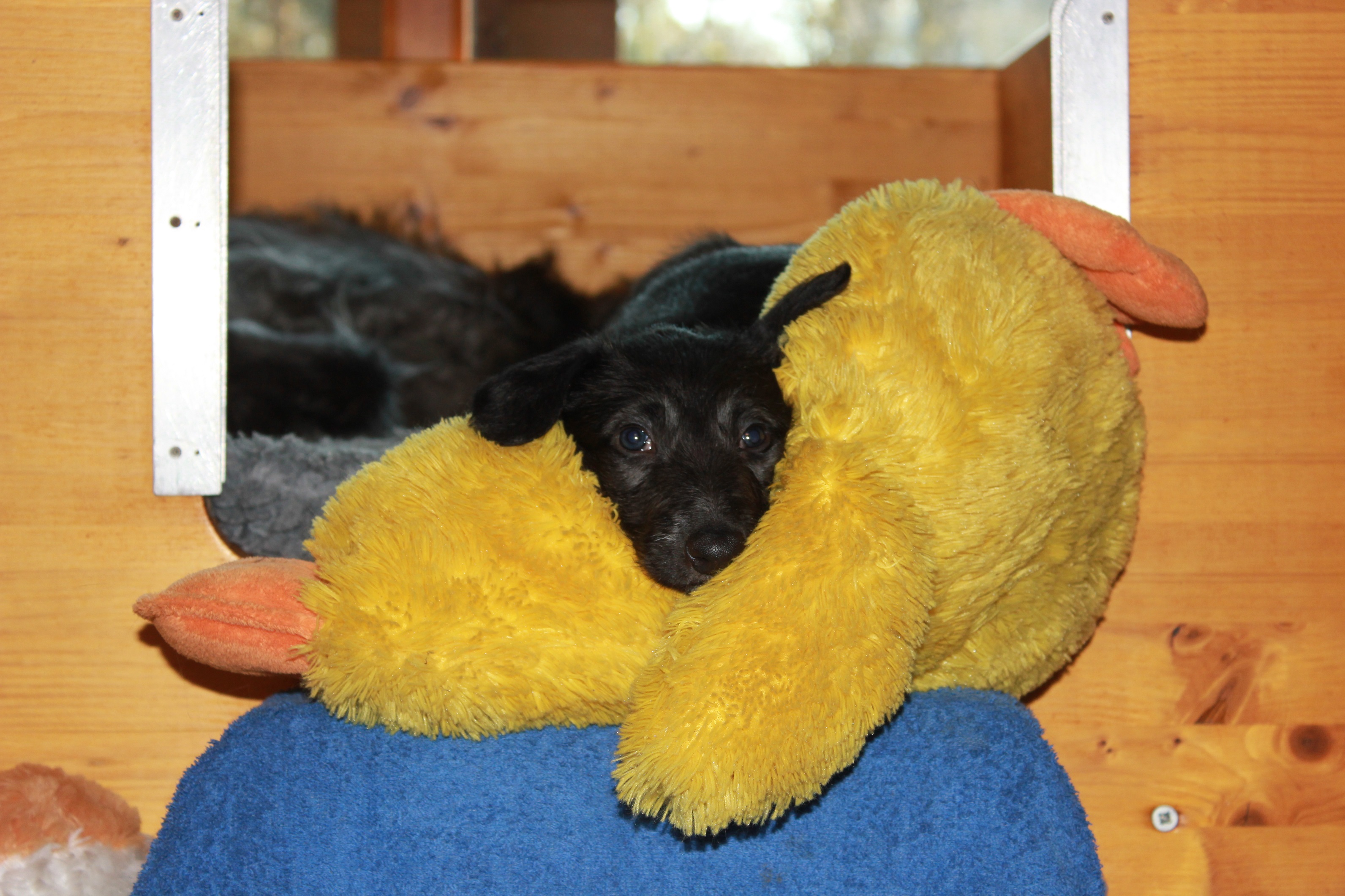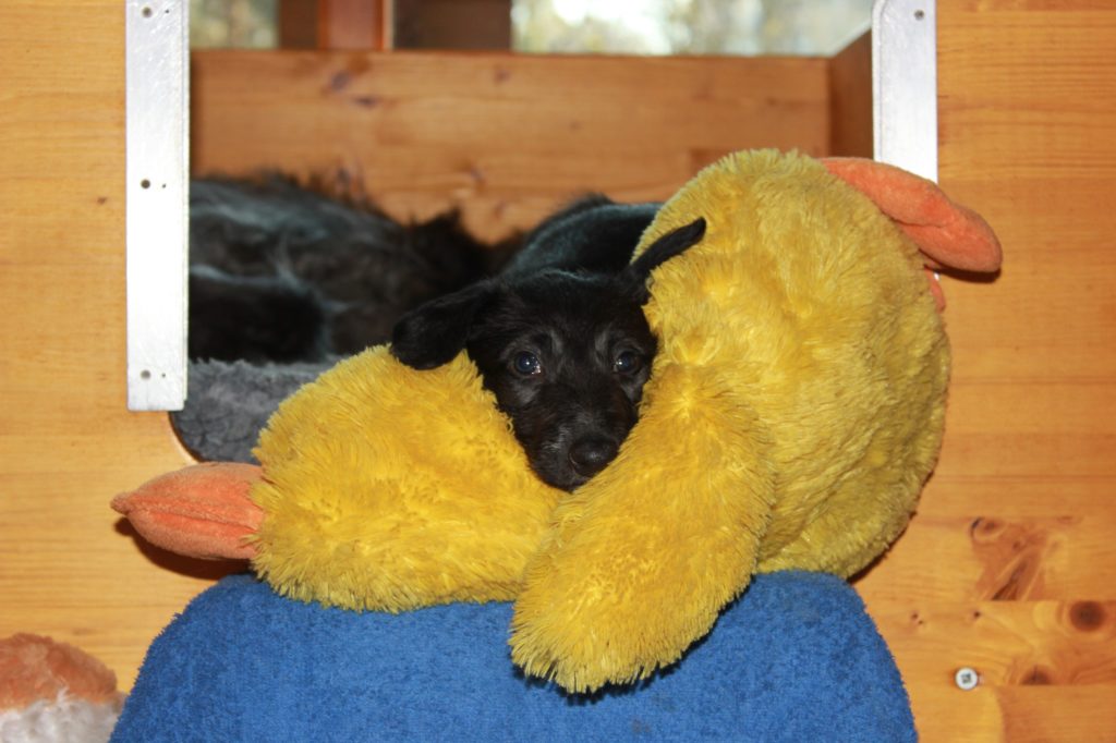 One puppy, the smallest one, who was born weighing 270 grams, always came straight to me and snuggled up close. She had chosen me and also won a special place in my heart, because she was the one who had almost been strangled when her brother got his paw caught in her collar. She was also just like a toy dog! Our Cephyr, 9½ weeks.
