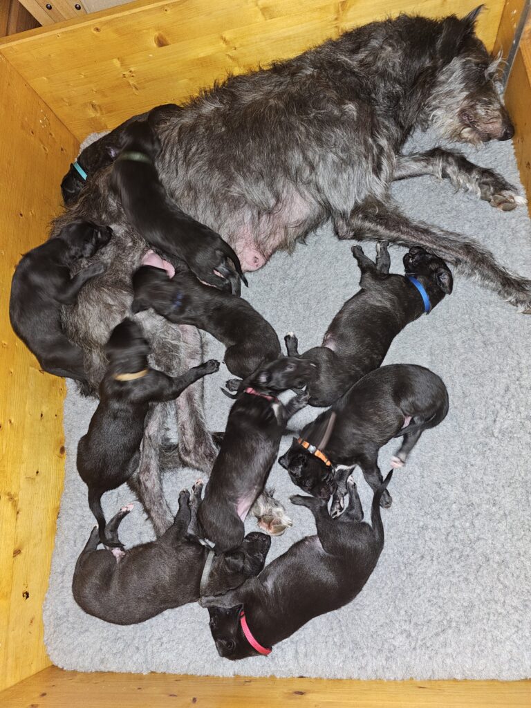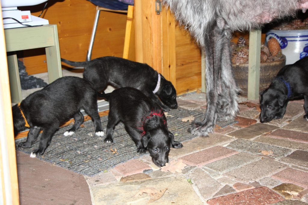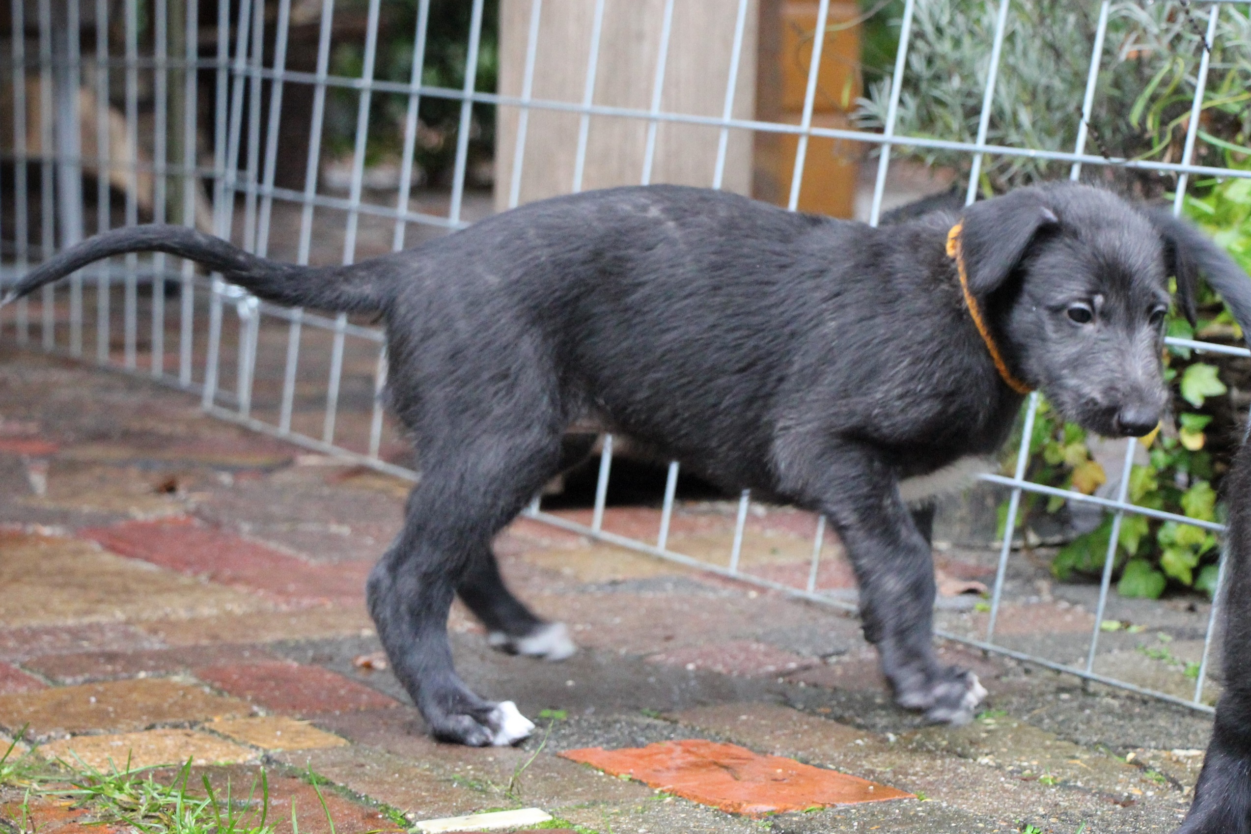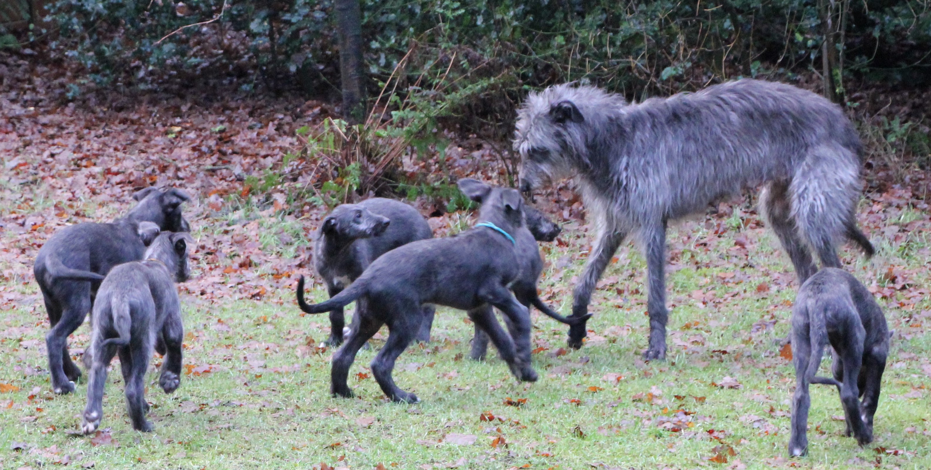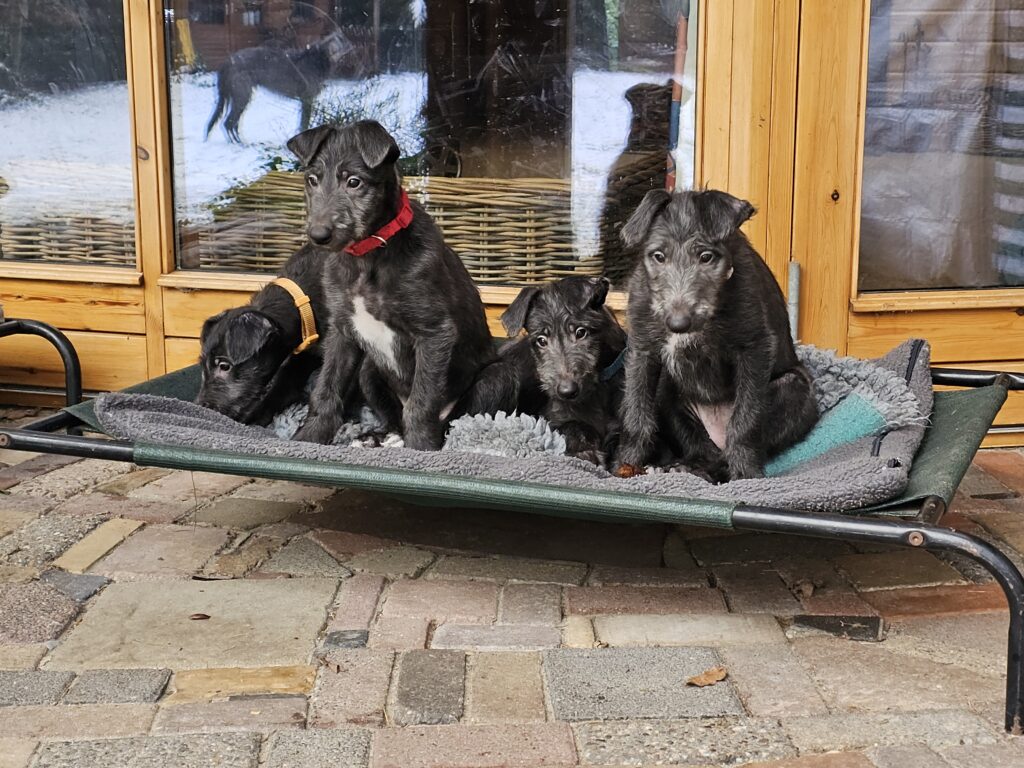 It’s unbelievable as soon as all the time goes! Tomorrow Cearrean is 8 weeks old and he weighs almost 10 kilos. He develops very well, grows nicely evenly, is tidy, listens well to his name, walks nicely on lead, finds driving in the car no problem, is practically not afraid of anything and if you correct him you get a big mouth back! Driving him around in the Doggy Ride is not a success, he screams all together, that is something for small dogs, not for Deerhounds. He also absolutely does not accept being locked up anymore. So the whelping box with the fence around it is already gone. A real Deerhound with a head on it! We will have some problems with that.
