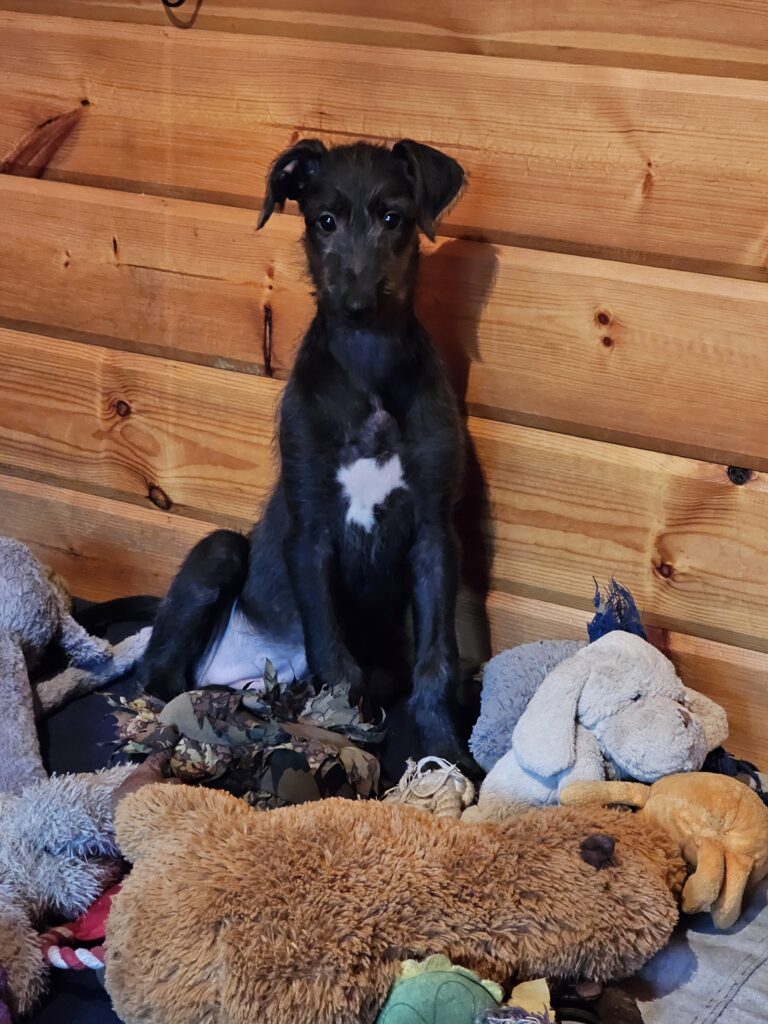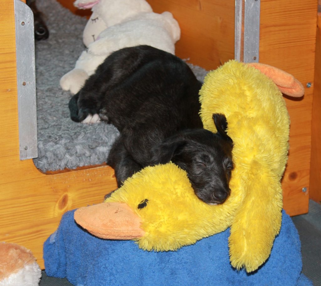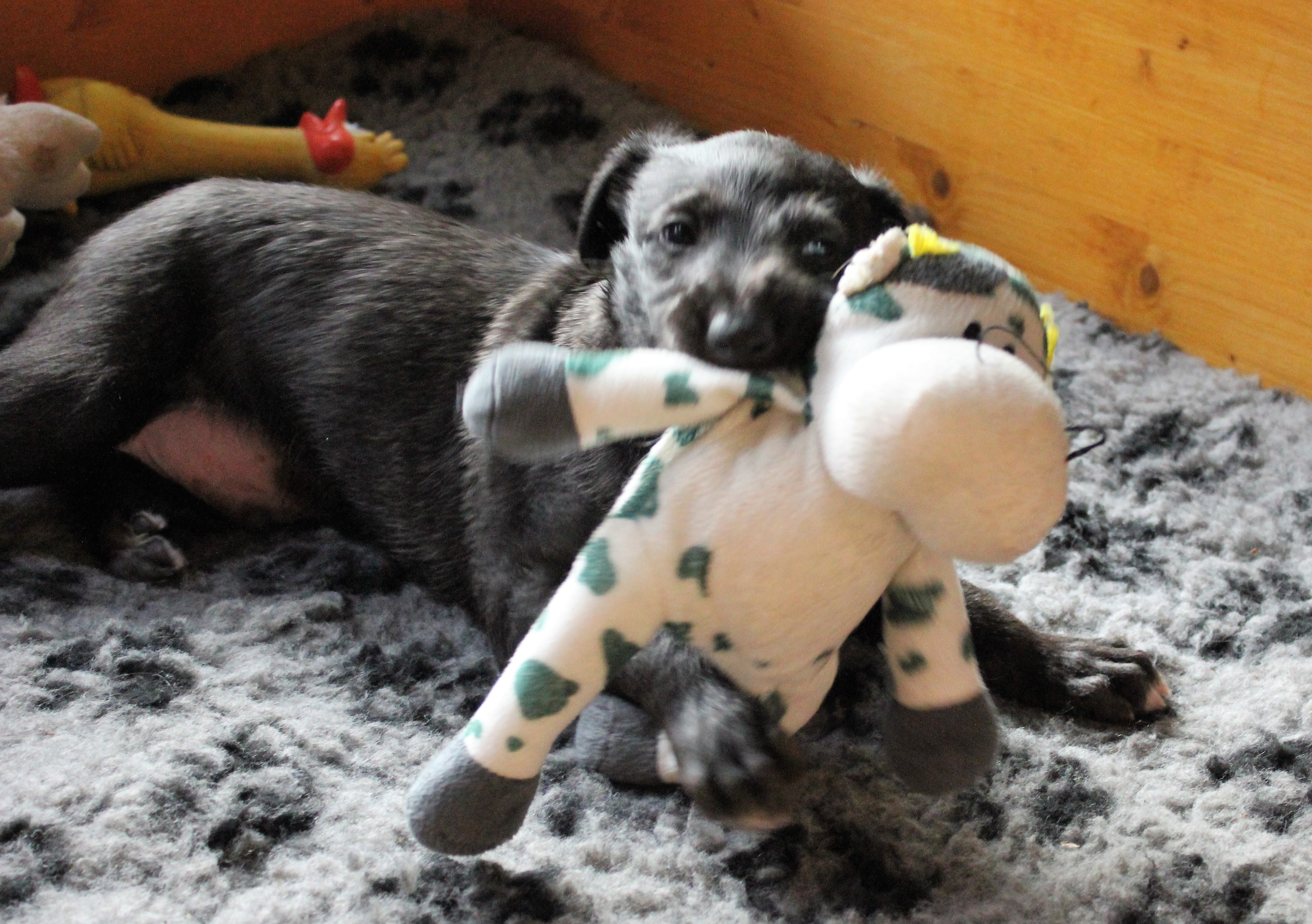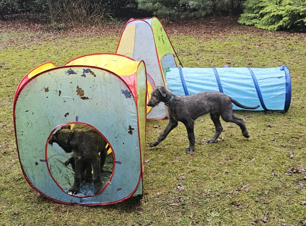 It’s unbelievable as soon as all the time goes! Tomorrow Cearrean is 8 weeks old and he weighs almost 10 kilos. He develops very well, grows nicely evenly, is tidy, listens well to his name, walks nicely on lead, finds driving in the car no problem, is practically not afraid of anything and if you correct him you get a big mouth back! Driving him around in the Doggy Ride is not a success, he screams all together, that is something for small dogs, not for Deerhounds. He also absolutely does not accept being locked up anymore. So the whelping box with the fence around it is already gone. A real Deerhound with a head on it! We will have some problems with that.