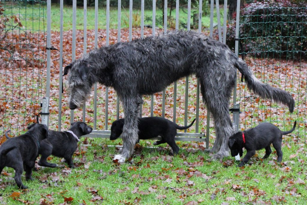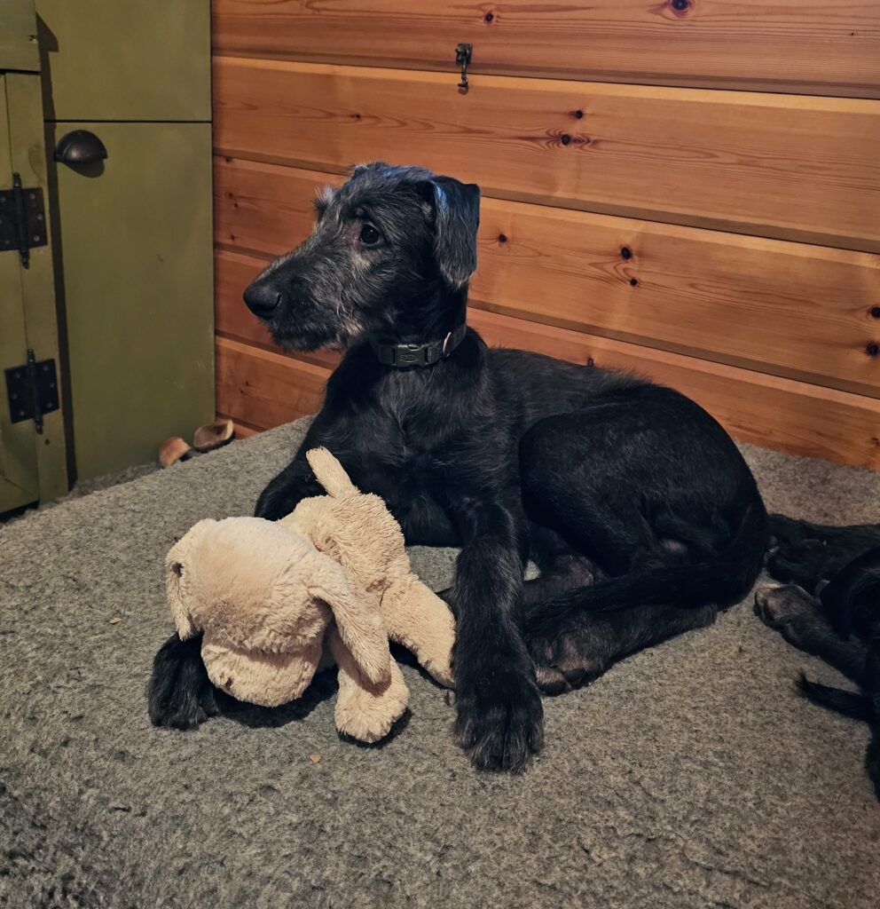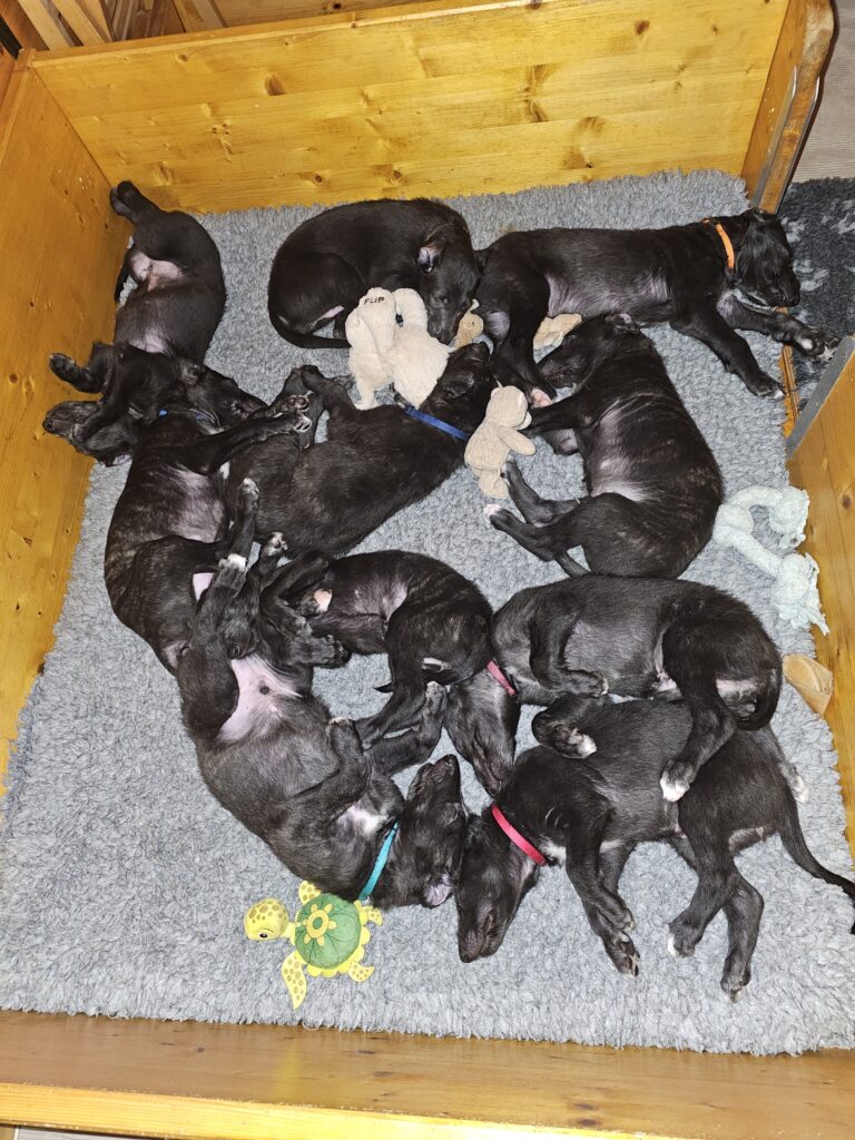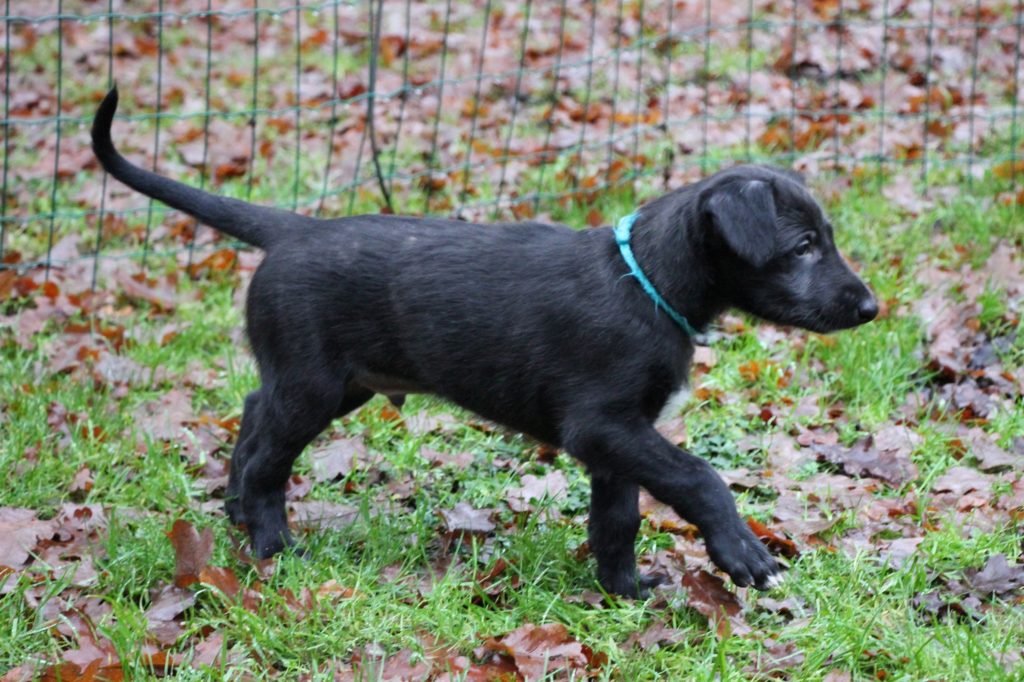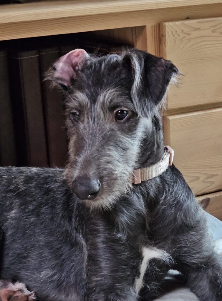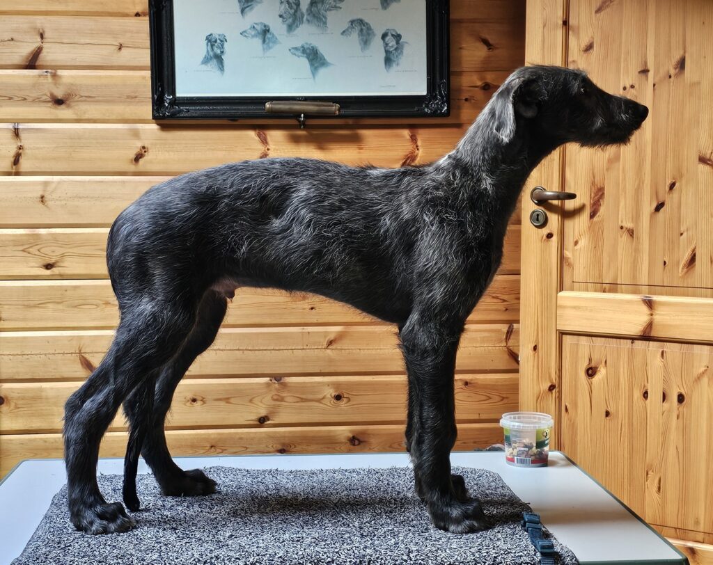 It’s unbelievable as soon as all the time goes! Tomorrow Cearrean is 8 weeks old and he weighs almost 10 kilos. He develops very well, grows nicely evenly, is tidy, listens well to his name, walks nicely on lead, finds driving in the car no problem, is practically not afraid of anything and if you correct him you get a big mouth back! Driving him around in the Doggy Ride is not a success, he screams all together, that is something for small dogs, not for Deerhounds. He also absolutely does not accept being locked up anymore. So the whelping box with the fence around it is already gone. A real Deerhound with a head on it! We will have some problems with that.