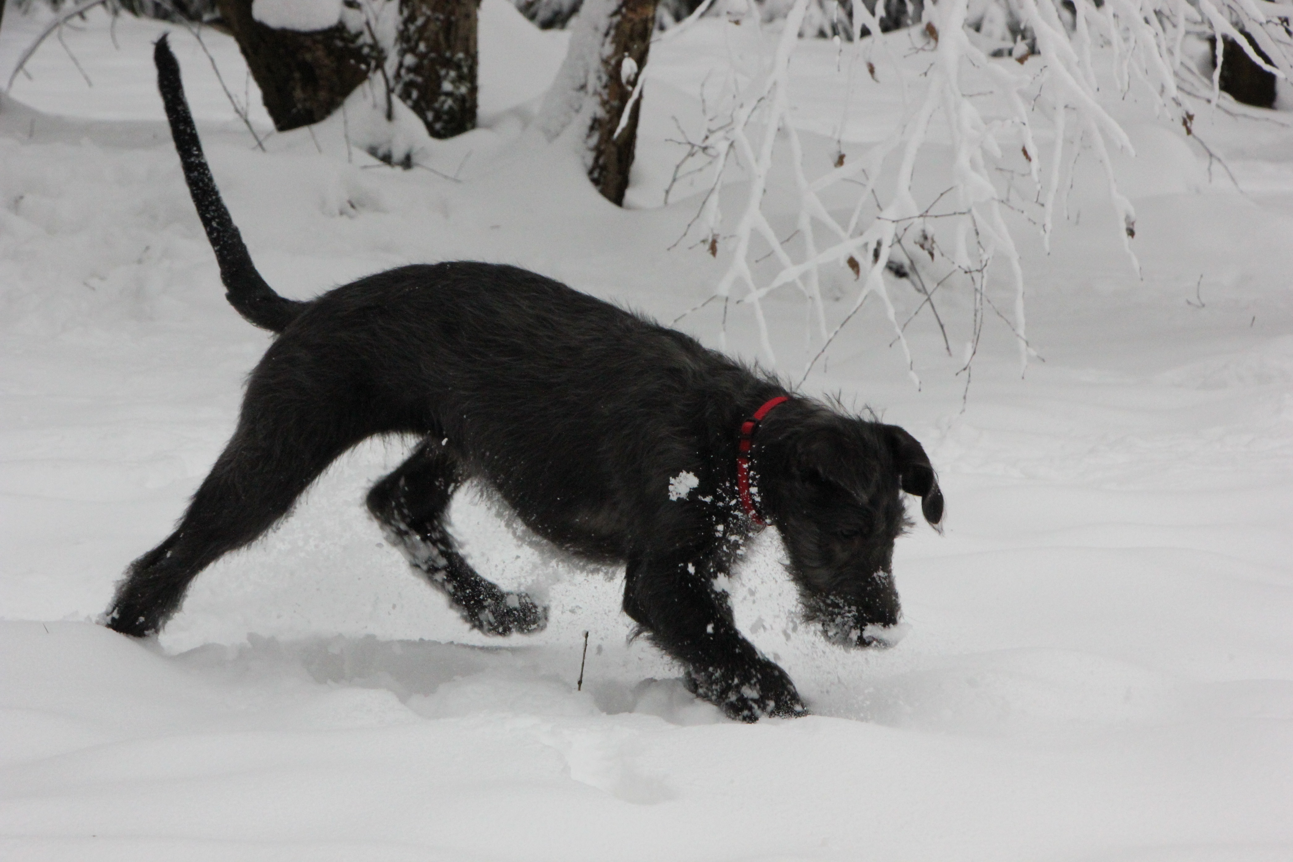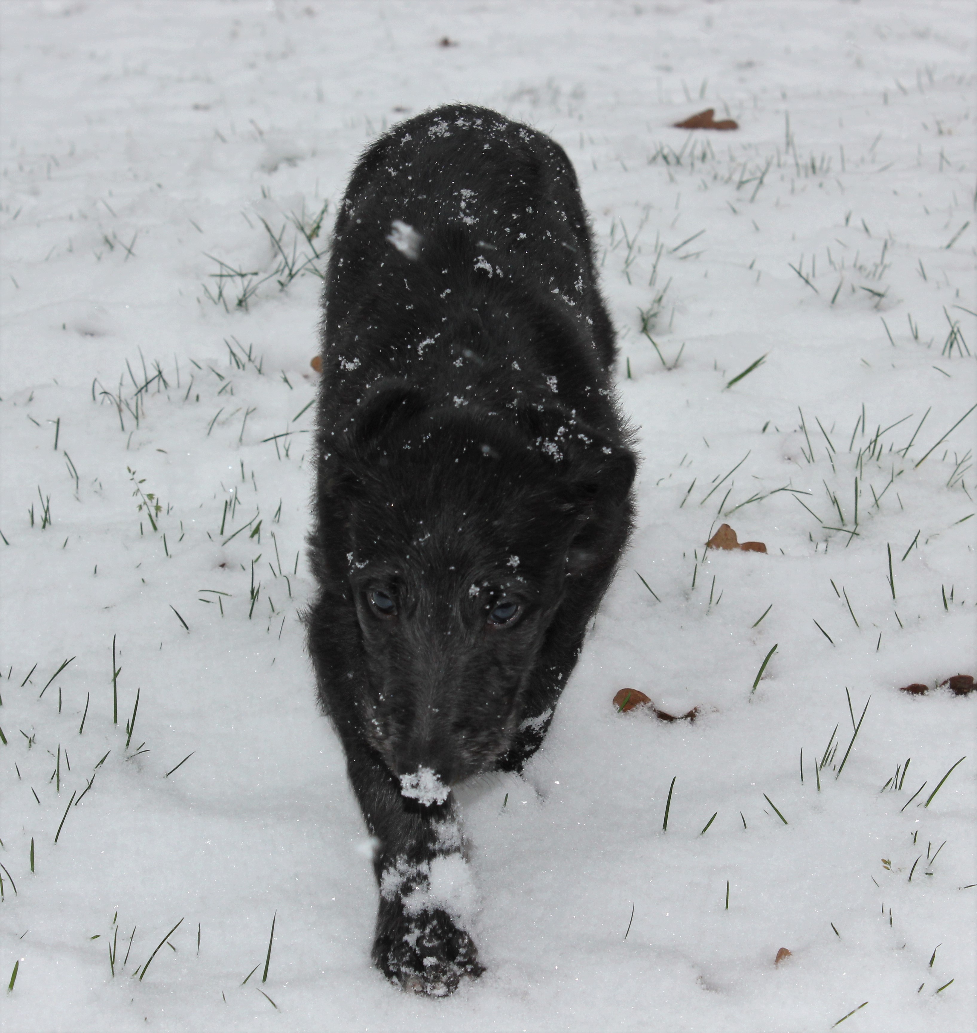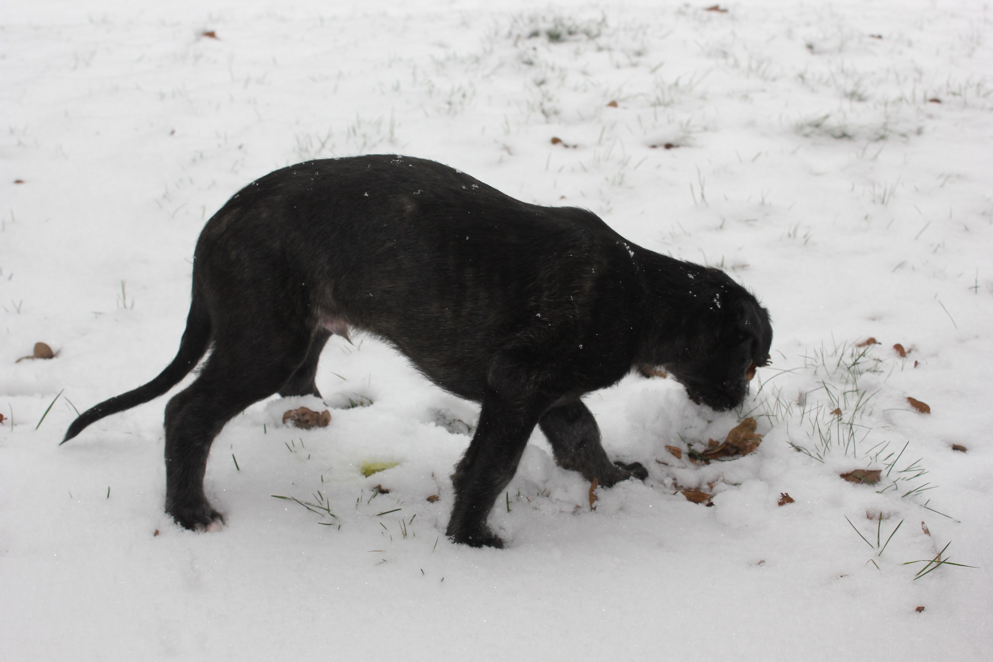 He is quite independent and does not shy away from anything. When the ground was frozen, he thought it was strange for a while, but after a few seconds he just walked over it, just as with the snow. He soon went through with his nose, but he did not last very long, it was very cold anyway!