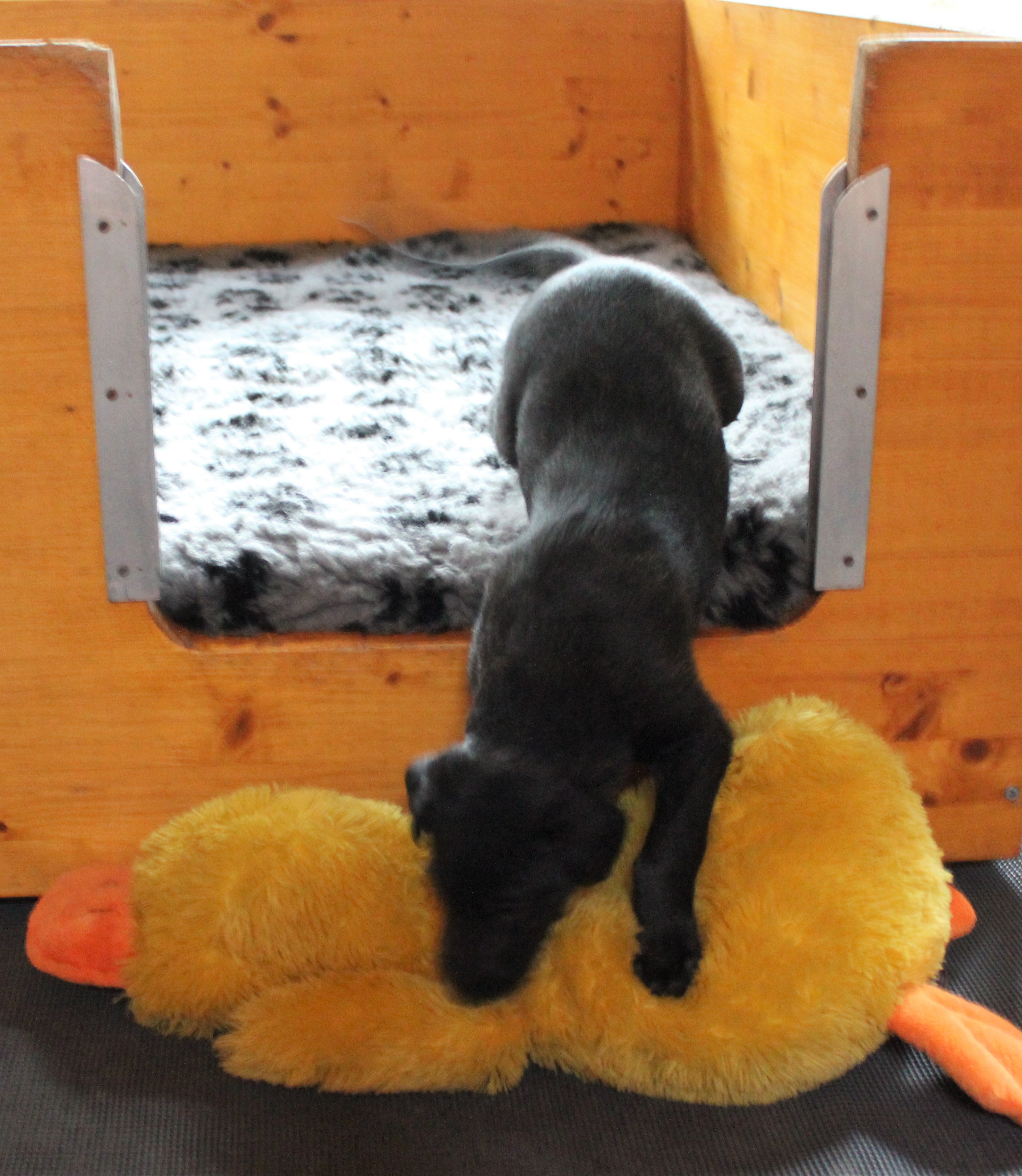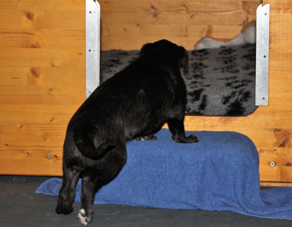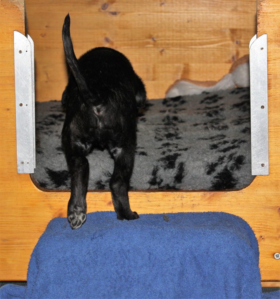 Yesterday we moved the whelping box to the living room and put down a piece of tent carpet (fine-meshed rubber carpet) so that Cearrean has good grip. For fun I had put the duck down as a step, but in no time Cearrean really used it to get in and out of the whelping box! But because the duck rolled away every time, Simon has arranged a more stable step today.