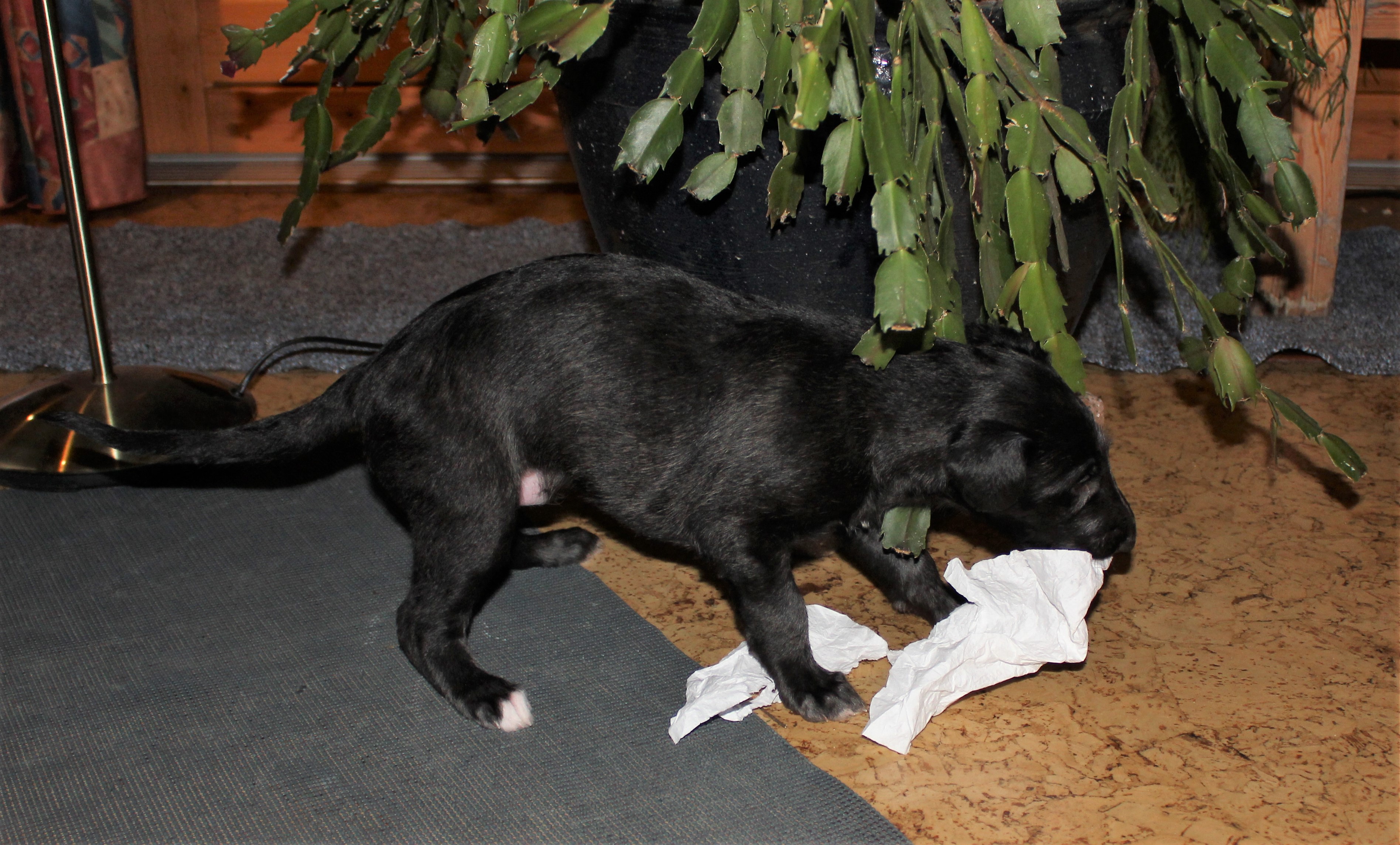 Yesterday Cearrean was 4 weeks young and weighed 4460 grams. In the meantime he is whelpingbox-trained, which means that he also wakes me up at night with a lot of squeaking because he has to pee. This he does nicely on a towel and then he runs through the house and I behind him with a piece of kitchen roll, and he seeks a place to defecate. He does this very regularly and unfortunately several times a day. I found it quite easy once in two days! But of course this is better and healthier. He prefers to eat with his mother, but we limit that a little bit, there are quite a lot of things that he can not digest yet. The steak tartar he find the least tasty, ground tripe and muscle meat is much better!