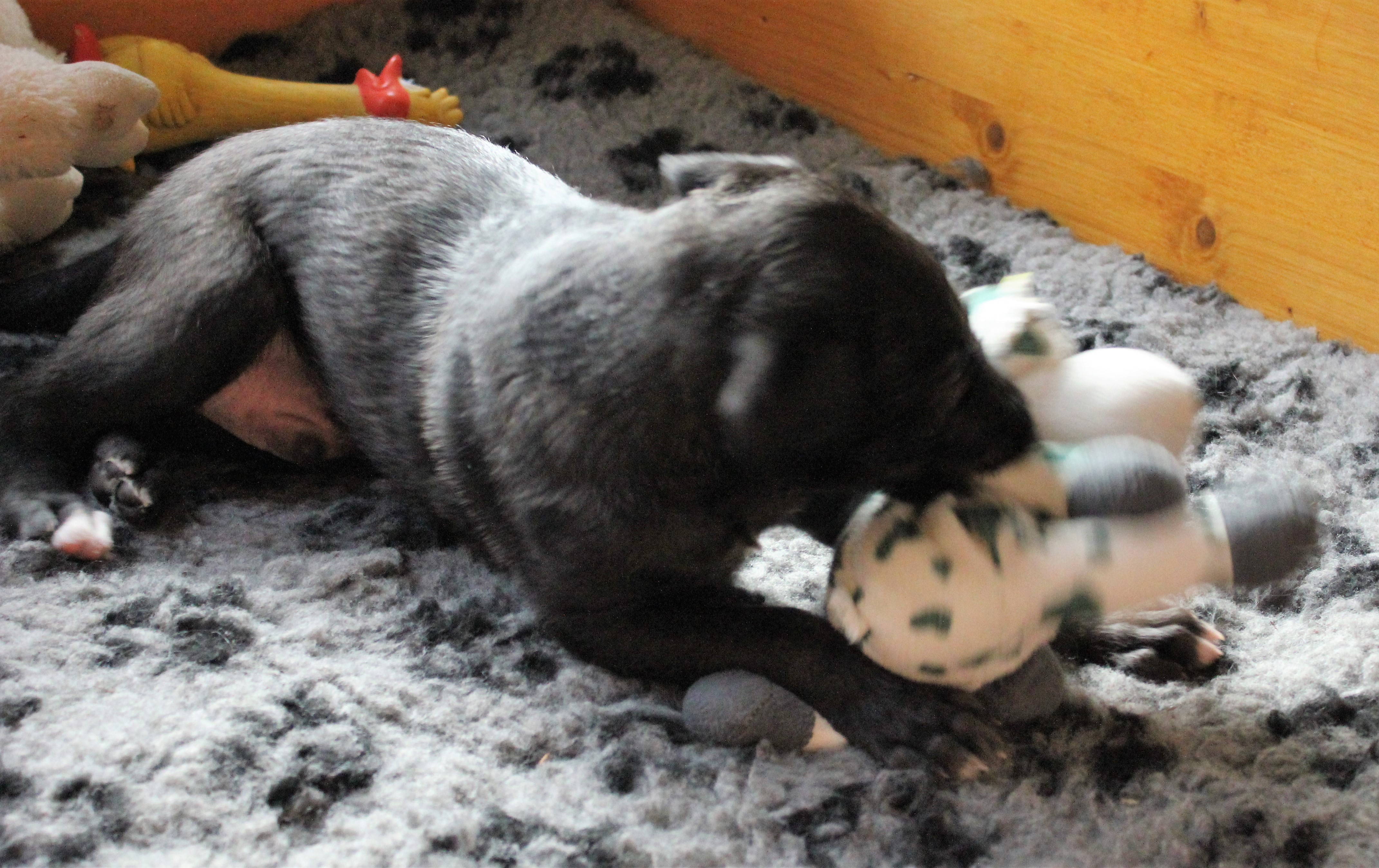 Cearrean is not bored at all, toys enough! And he knows how to find this basket flawlessly and then to drag a toy to the whelping box. And after a game of romp it is good to rest on a warm spot with mom Cytaugh.