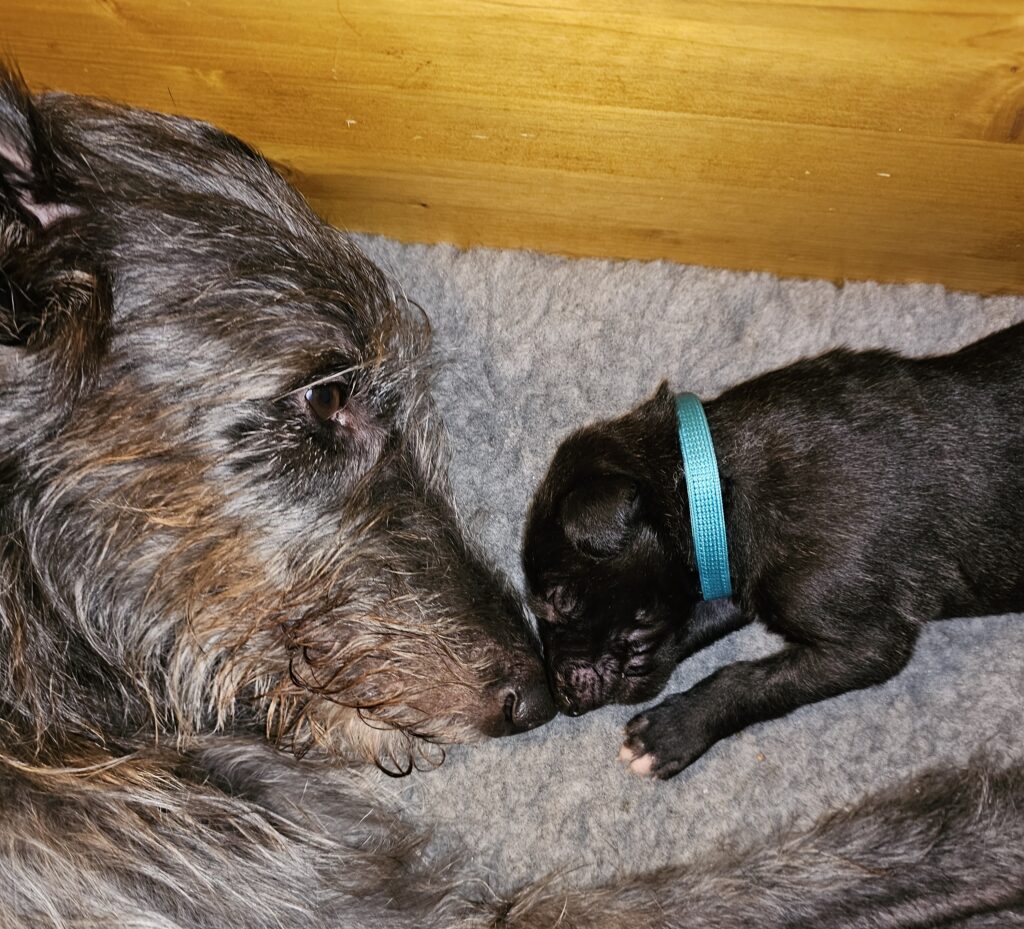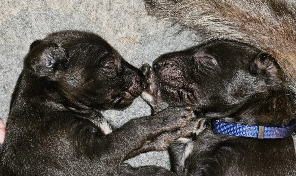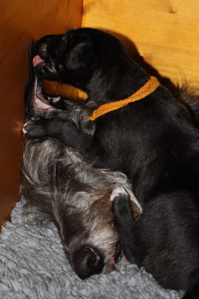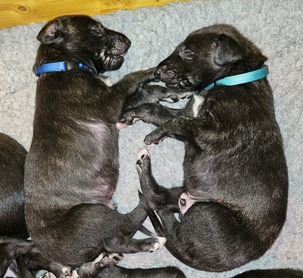 Today the puppies are 10 days young and Callaghan has tripled his birth weight + 51 grams, he weighed 1086 grams this morning. Conaughey has been taking it a bit easier in recent days and now weighs 1390 grams. He can no longer be picked up with one hand. The colour difference is becoming increasingly clear, I wonder what this will be. Vision was very light as a puppy so maybe Callaghan will be like that, I don’t know. I have not yet had this colour in one of my litters.