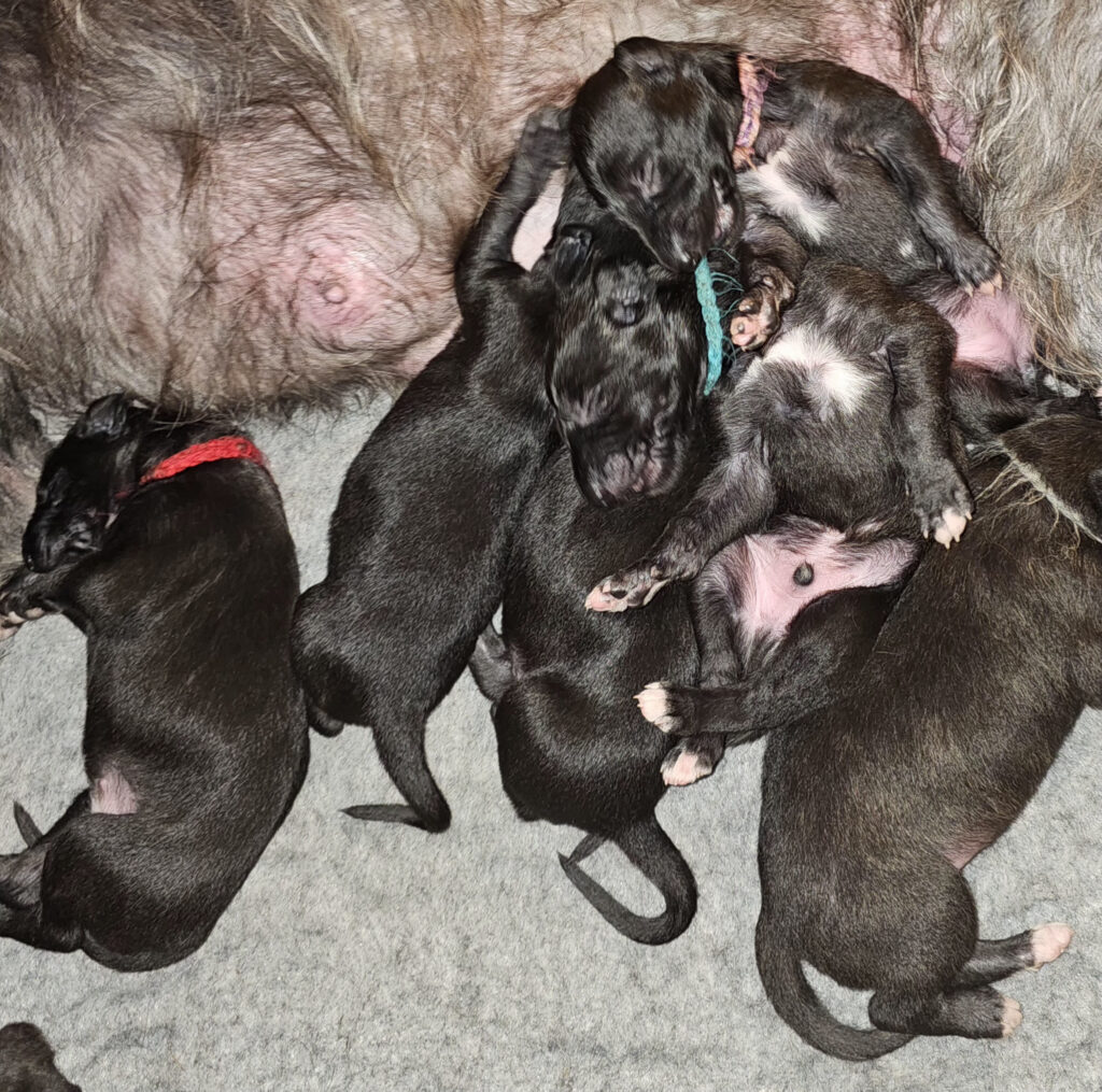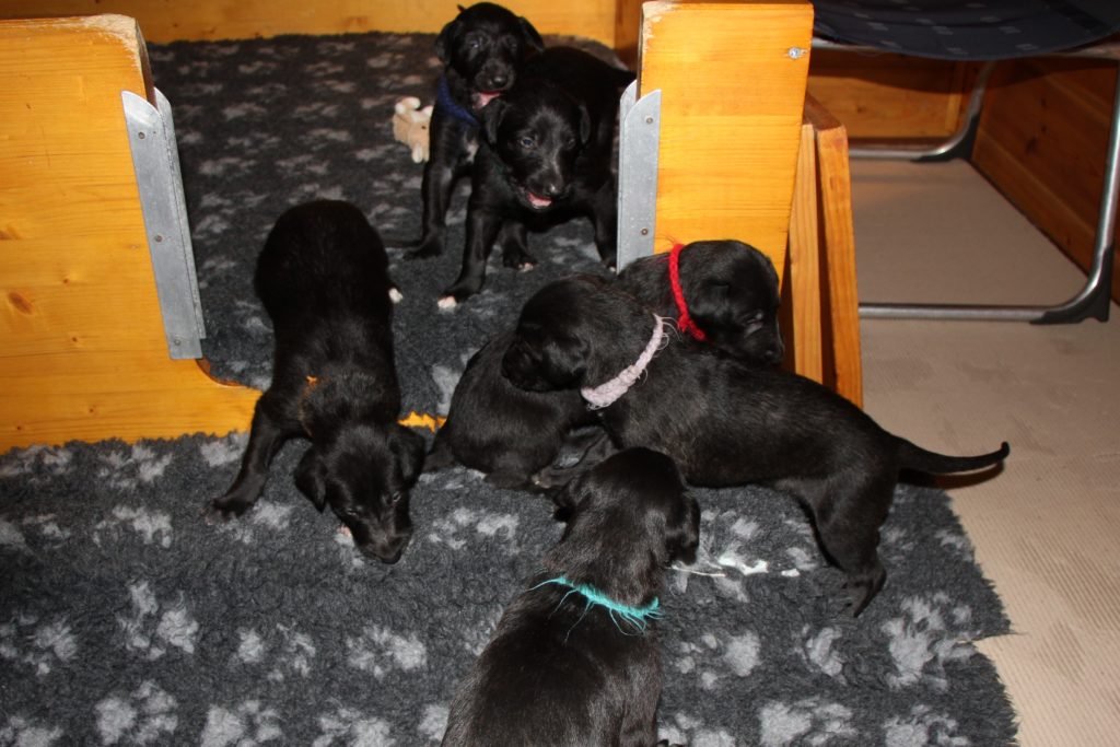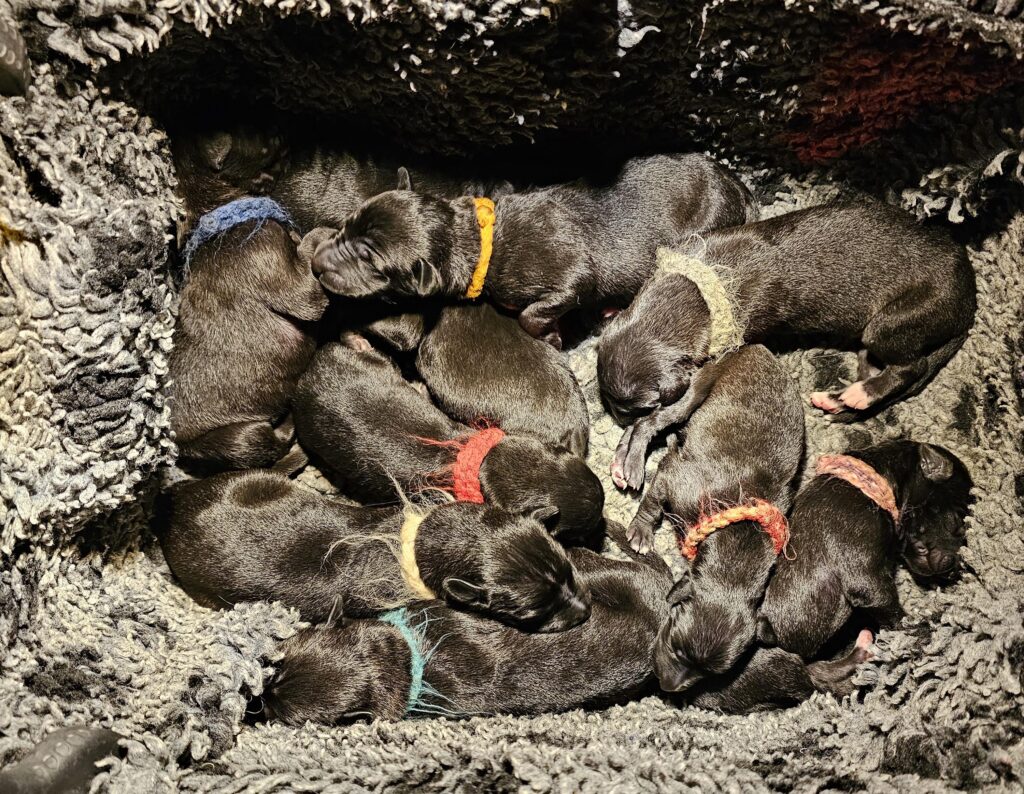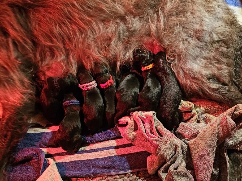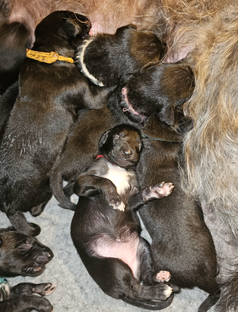 The first few days went well. The puppies have not lost any weight and have started to grow well right away. During the nights we take turns to keep a close eye on Charlaigne and the little ones. But she doesn’t get up a single time and turns out to be an exemplary mother. She has plenty of milk but …. unfortunately only 8 nipples! So the puppies have to take turns drinking, 5 to 5.