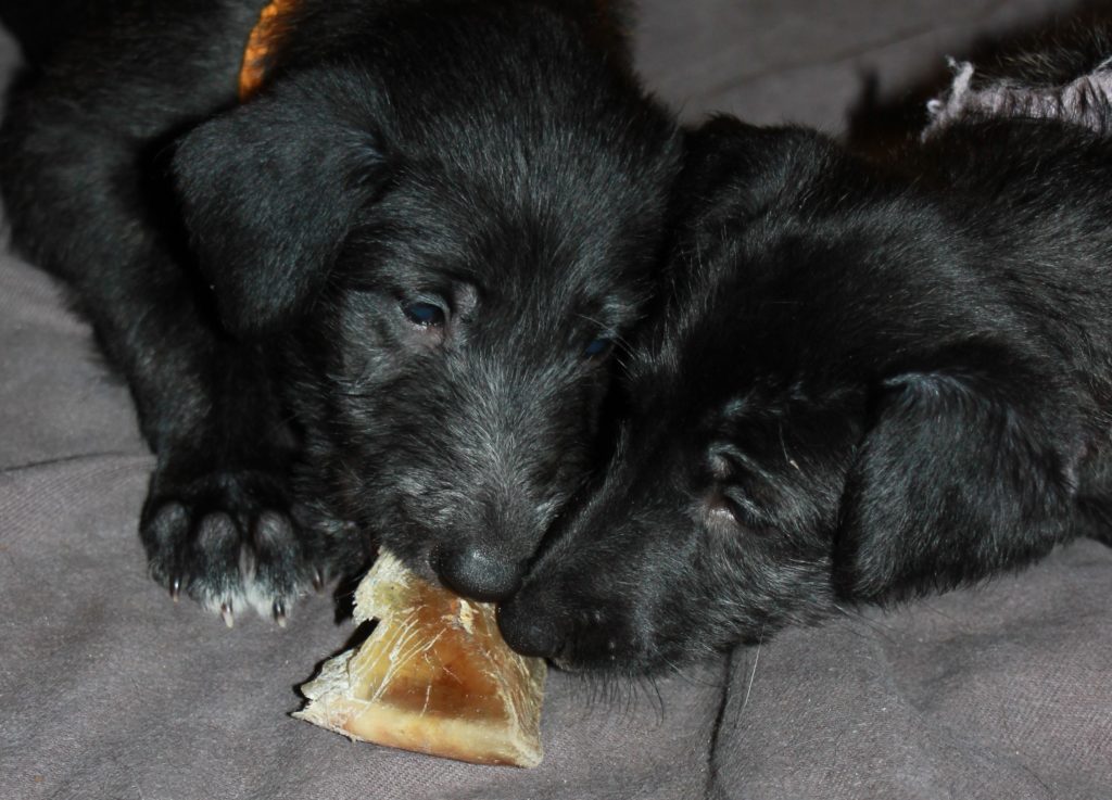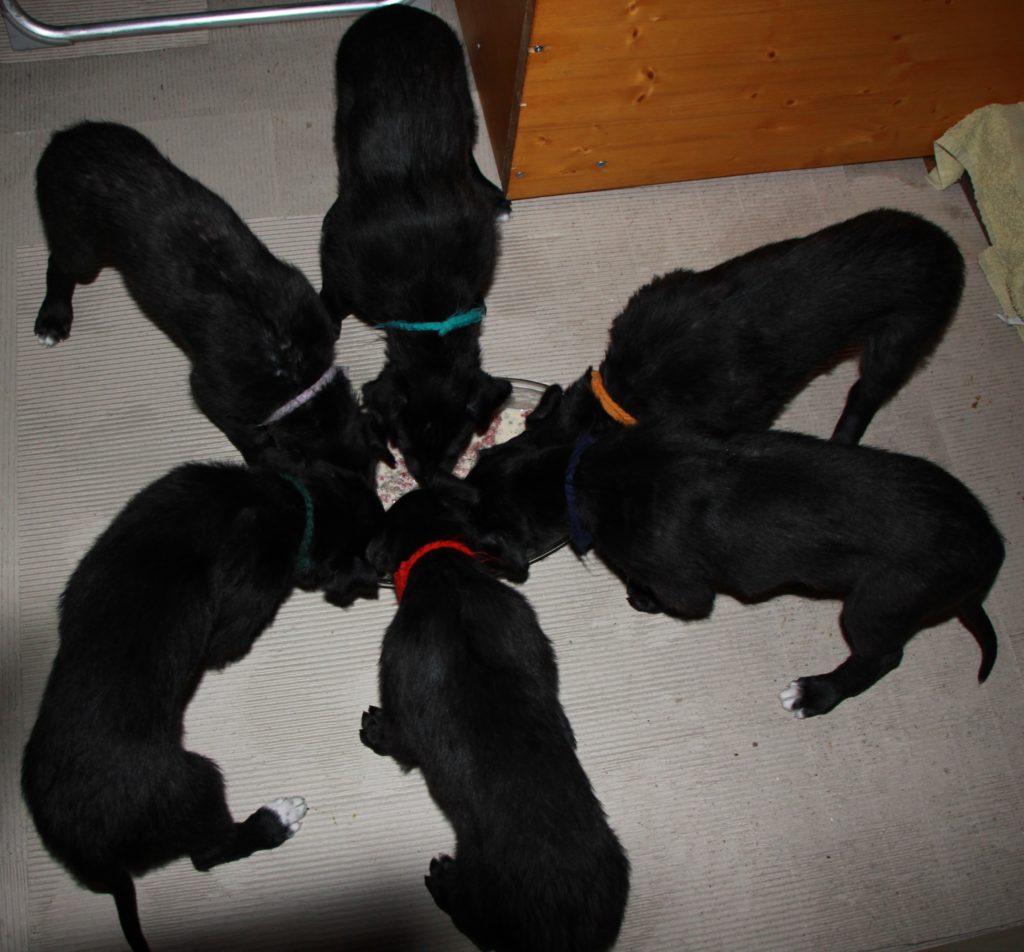 Yesterday the puppies were 4 weeks young, how fast it goes! It is also very easy, 2 puppies. A week and a half ago they suddenly dipped into Vision’s food bowl, delicious… Rinti, tripe, milk and sheep fat! Since then, they regularly get