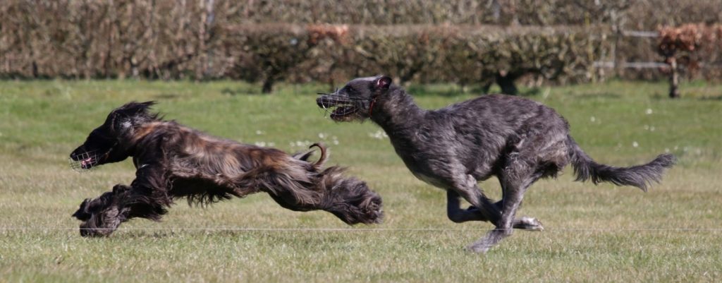 Simon had been busy all week trying to figure out a good course. The field was a bit on the narrow side and completely bordered by tall trees. But in the end he managed to lay down a nice long and safe course. We had around 33 courses both in the morning and in the afternoon with most of the hounds running solo. I always like to have several hounds of different breeds running together and that’s why Crumbaugh ran together with Mika and Kimmi, the two Afghan males of John and Karin Alt. What fun and beautiful courses those were! Especially in the afternoon they were not inferior to each other and it was a chaotic gang of people at the finish who tried to grab the hounds while they tried to take the hare from each other and jumped around each other. At one point, Crumbaugh just dragged Mika along!! And all that without even once growling at each other!