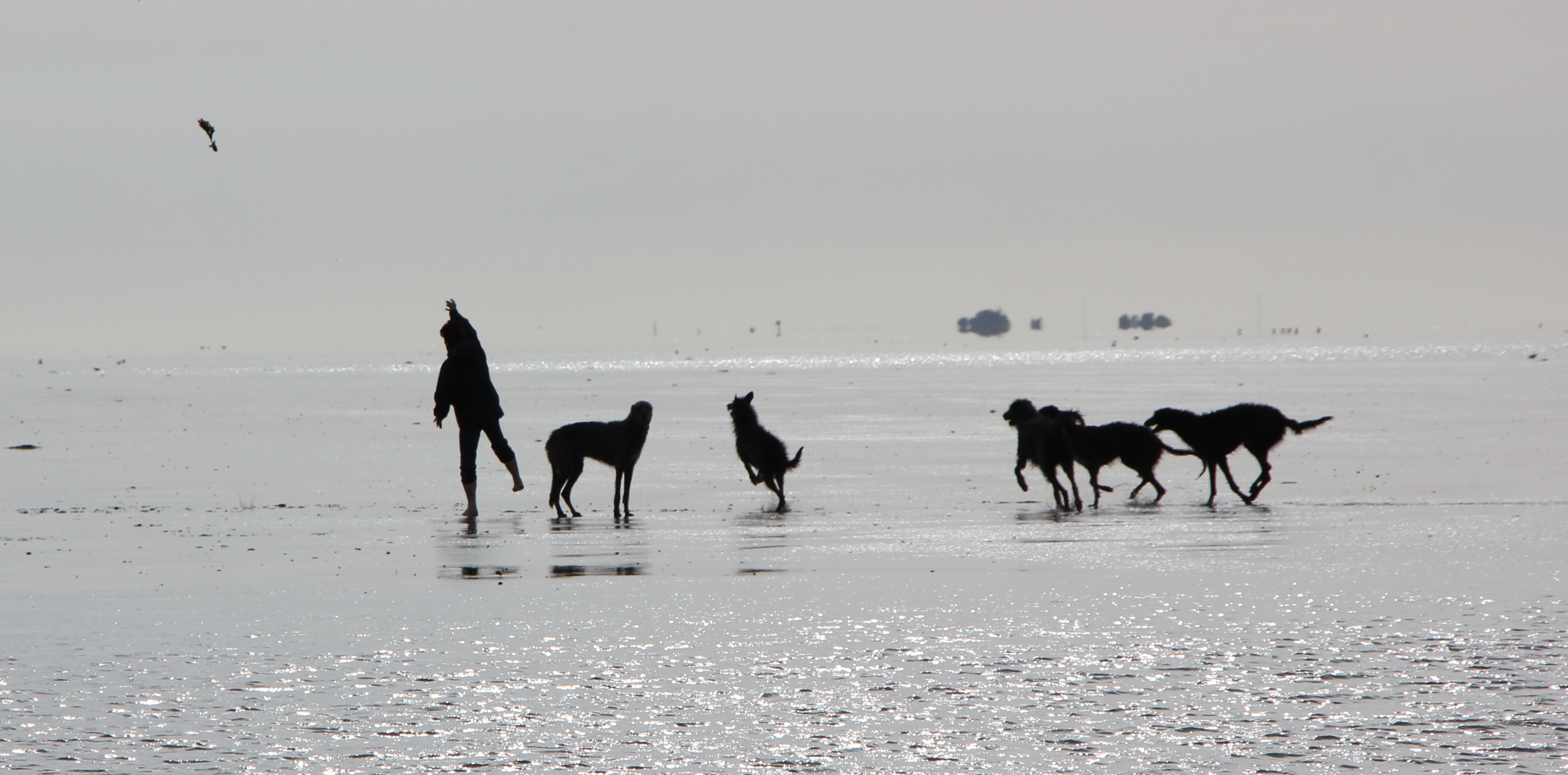 If the moon phase is good, and therefore not a full moon like this week, you can walk for miles here. There is then about 5 centimetres of water on a mirror-smooth seabed. Ideal to let the hounds race. But unfortunately the water did not drop more than about a foot now and that is a bit too high for Cranston. The first time Simon walked into the
