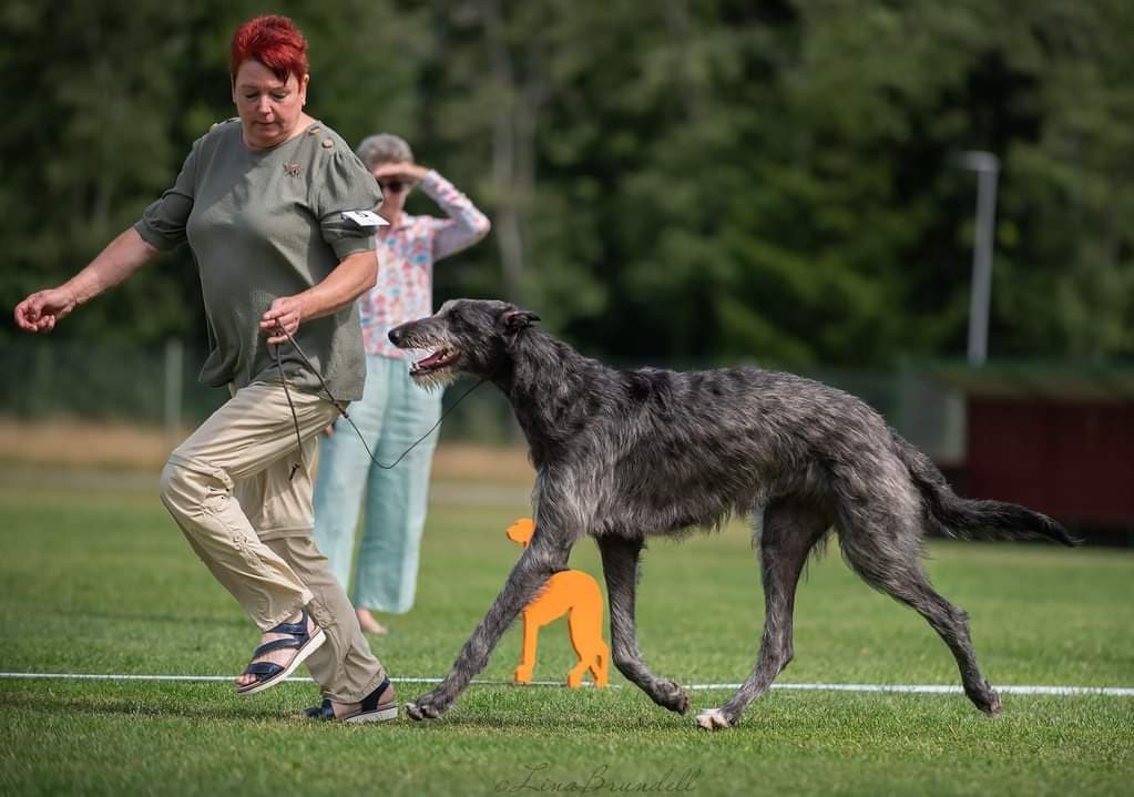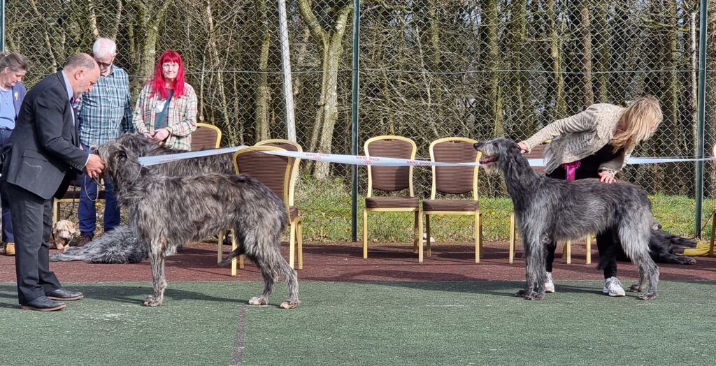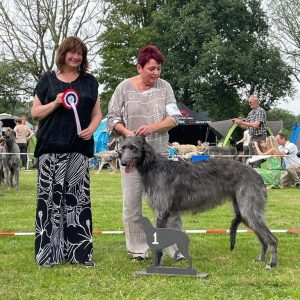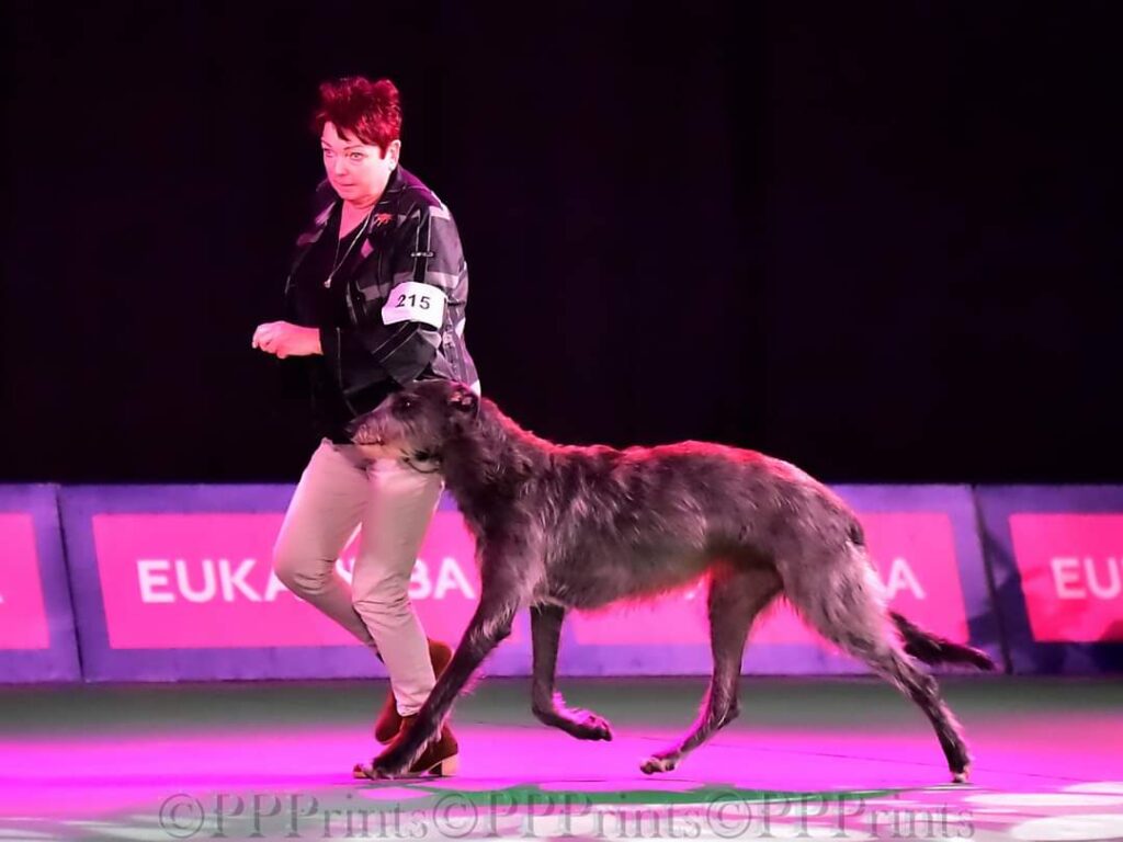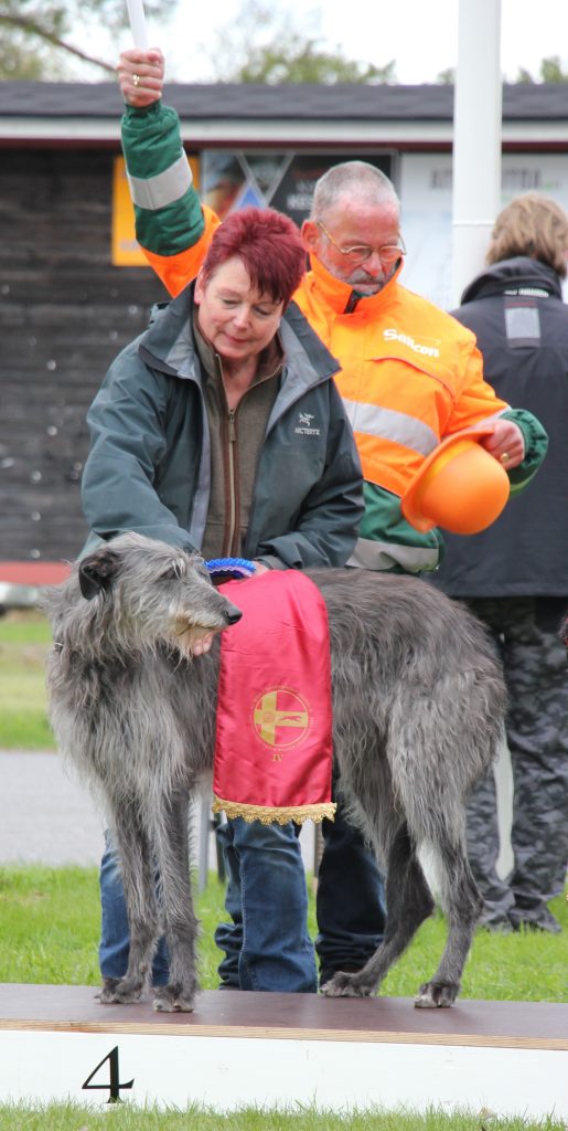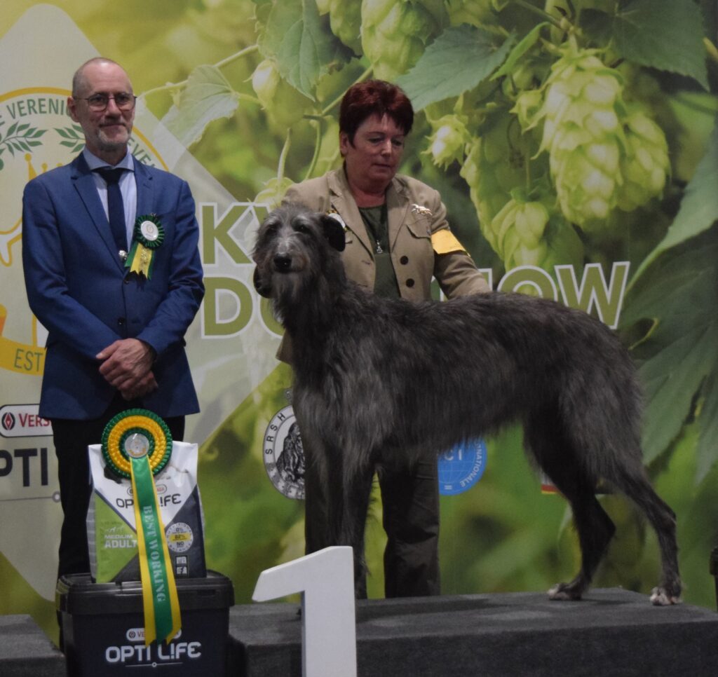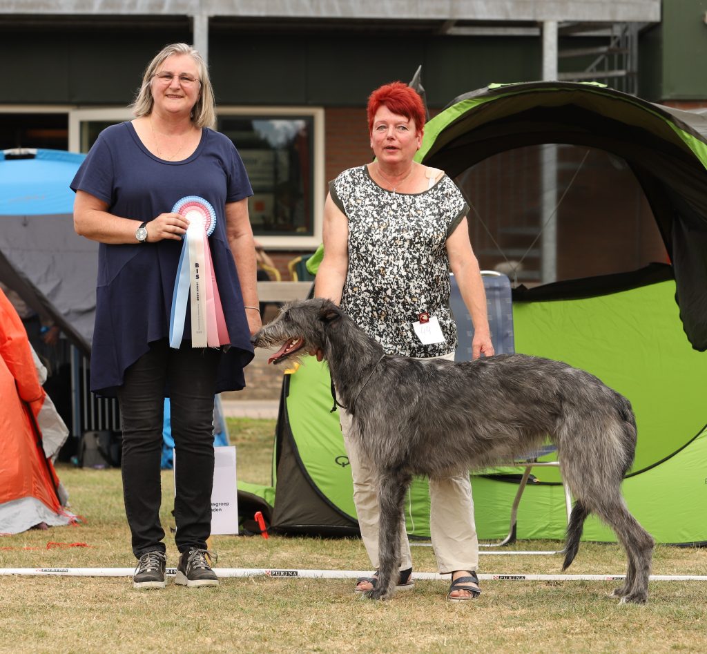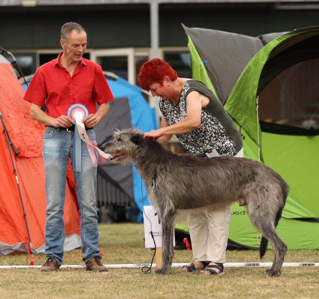 On Saturday we had Clare Drew as judge. She grew up among the Lealla Deerhounds of her parents Tony and Mary Churchill. A total of 77 Deerhounds were entered, of which 24 were males and 53 females. Charlaigne finished third in her class. Best Male and BIS was Sam Taylor’s Ormanstar Dark Shadow and Best Female was again Packway Smackfarthing.