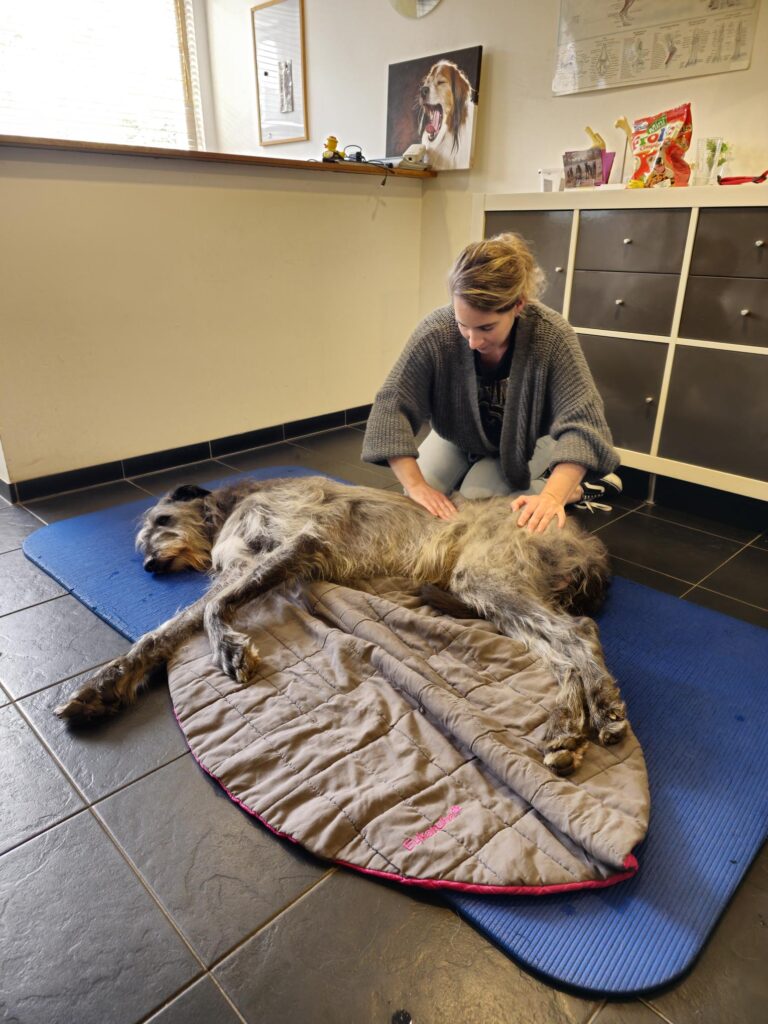 Last year, in mid-October, Brandir started hydrotherapy. We drive weekly to Rucphen where Corinne Somers has her practice. Since there was a clear improvement in stability, and if we skipped a week a decline, we do this every week as much as possible. He now knows exactly what the order of treatments are; First massage and possibly some manipulation and then into the bath to then “swim” for 4 x 5 minutes. But… you can ask a lot of an old Deerhound as long as there is something in return, all this is not possible without pieces of cheese!