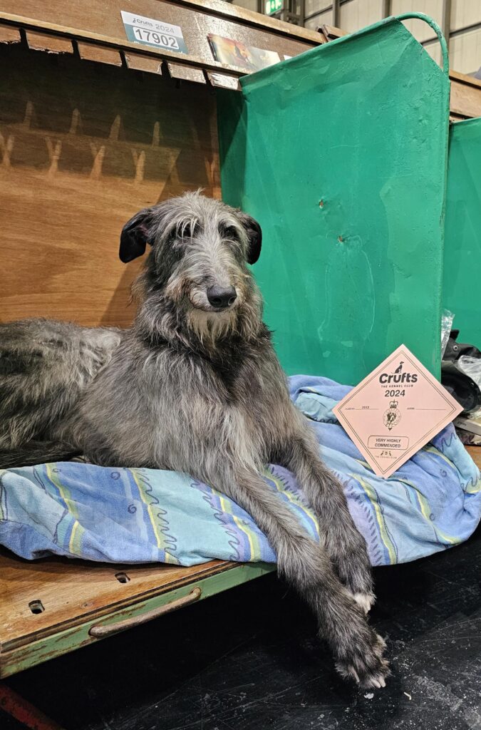 Sunday Crufts day. Our judge was Bryan Doak of the Rosslyn Deerhounds. He was clearly looking for the heavier type of Deerhound but still thought Charlaigne was good enough for a fifth place out of the 11 bitches present in the Open Class. Not too bad.