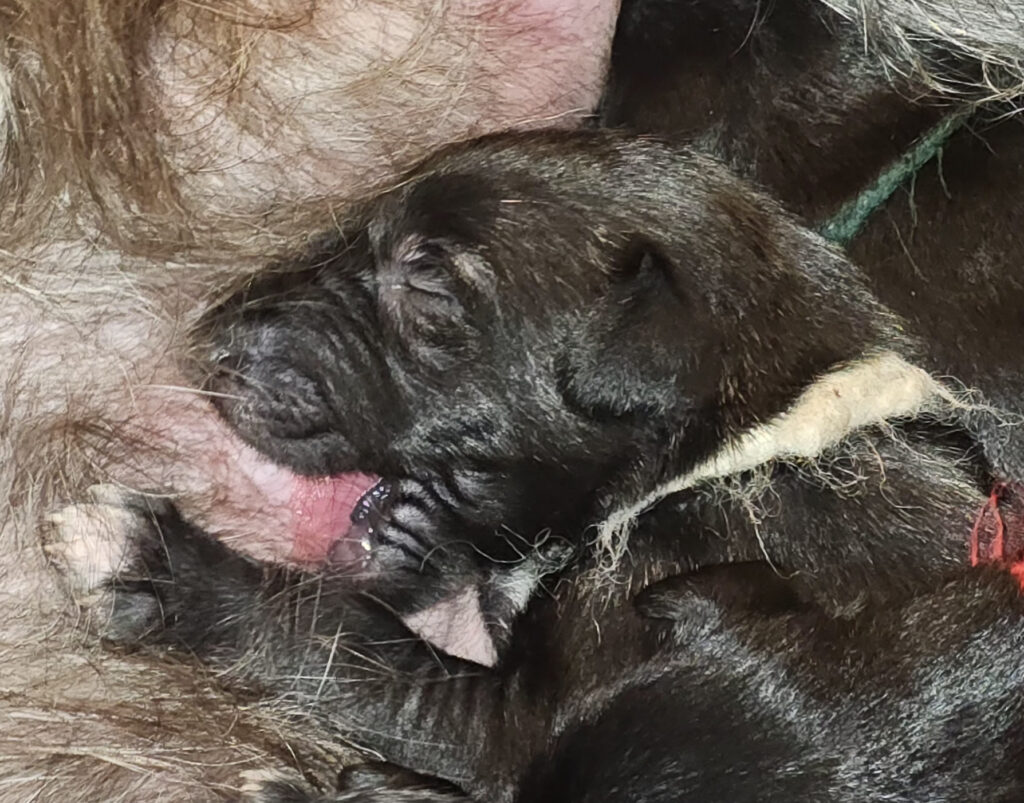 Meanwhile, we are a few days on and Charlaigne gave birth in the night and early morning of Tuesday 12 to Wednesday 13 November. The first pup came into the world at 0.45. A very small male of barely 300 grams. But very powerful with tremendous perseverance. While I was trying to remove the membrane, he crawled towards a nipple and tried to grab it but the placenta was still attached so he couldn’t go any further. That was a struggle for a while, also because it was the first pup and Charlaigne had no idea what was happening. But when the placenta came loose, he hung on to the nipple in a jiffy! At 2.10, a male (490 grams) and a female (380 grams) came in such quick succession that we were short of hands and also have no idea who was first. An hour and twenty minutes later came male number 3 of 400 grams and at 5.00 a bitch of 320 grams was born. At 5.15 came another male of 400 grams. Around six, Charlaigne had to go for a pee again but after peeing, she took the press position and a puppy popped out! Luckily I had a towel with me and was able to catch it just in time before it fell into the high wet grass! So it was a male of 420 grams. An hour later, a very tiny teeny-tiny bitch weighing 270 grams! was born. What a brat this was but also a little fighter.