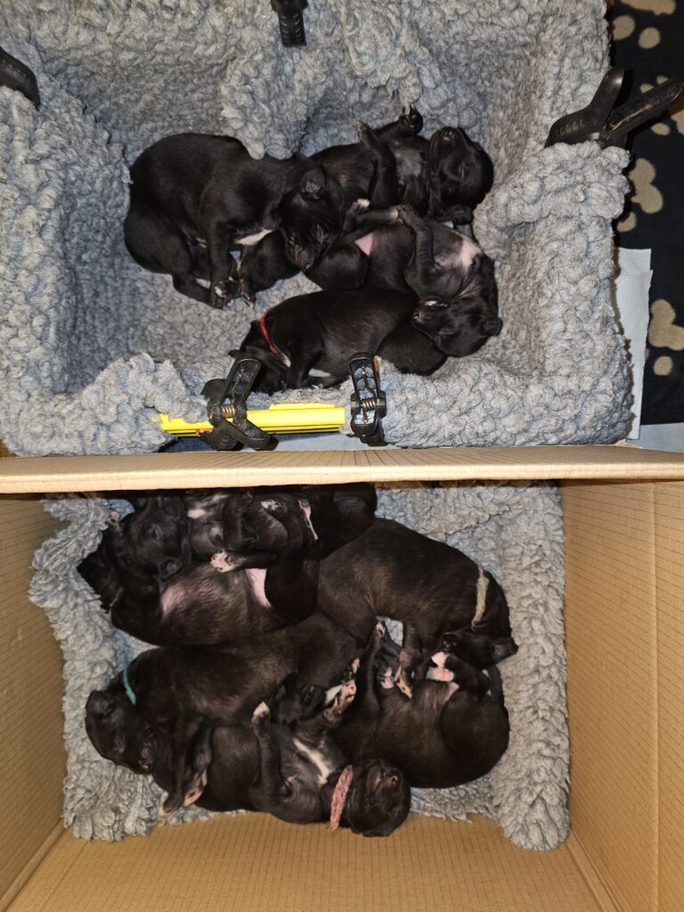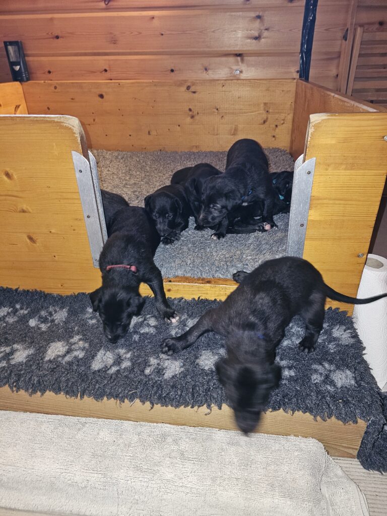 When Charlaigne has to go outside or to the vet, the puppies are in a crate. Meanwhile, there is also a bigger box next to it, as the biggest ones already came over the edge of the crate! There is also more peace and quiet when they have a bit more space.
