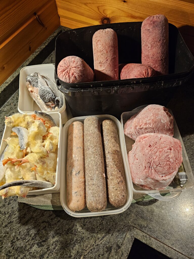 They grow well, they are more or less the same as the tables I still have from my previous litters. They mainly eat one-day-old chicks, sprats and all kinds of ground meat with vegetables, elderberries and seaweed. Meanwhile, Callaghan is almost as big as Cranston and last week the weight difference was only 450 grams. Callaghan weighed 5.65 kilo’s and Cranston 6.10. They are certainly not fat, it could be a little more but they seem to get enough because they would like to eat more. And it is actually better that they do not grow too fast, let them take it easy.