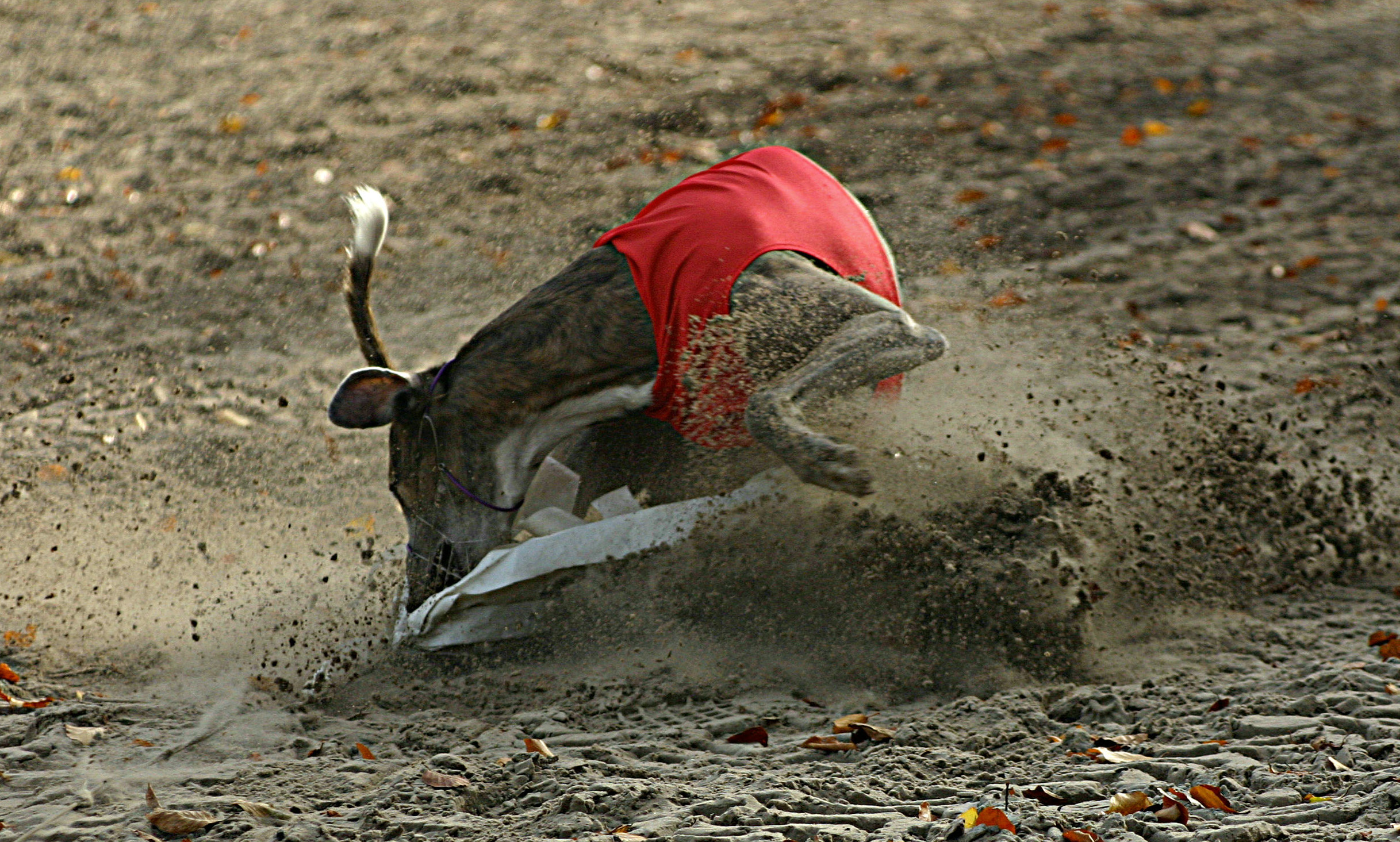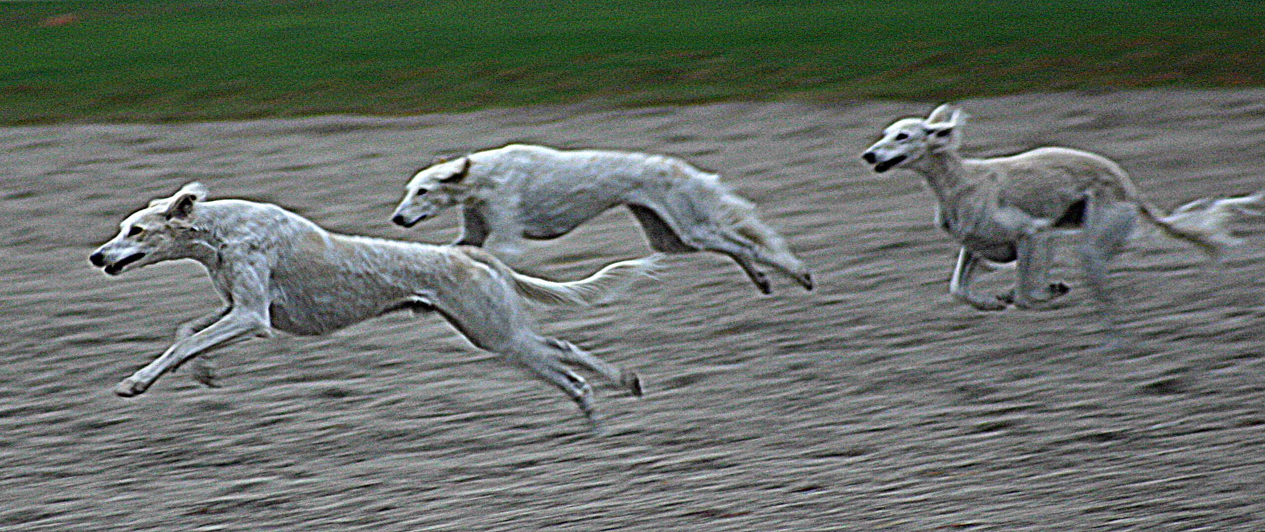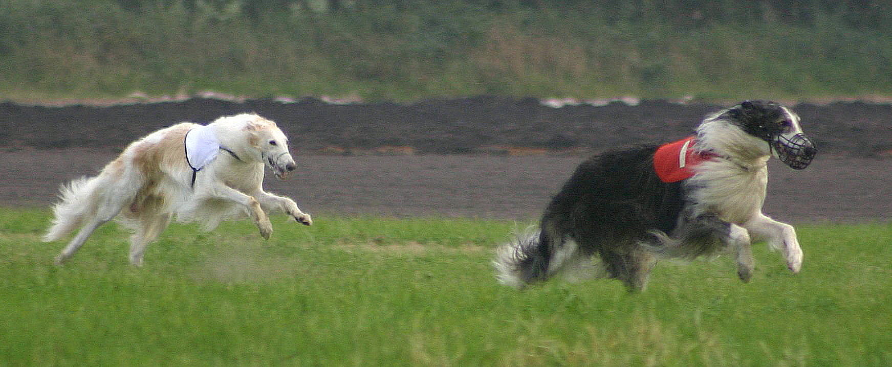 5. Enthousiasme – Dit is de geestdrift tijdens de achtervolging, ongeacht de bodemgesteldheid (ruw of met obstakels) en wat er zich ook voordoet, zoals het doorschieten in bochten, vallen, en het haas uit het oog verliezen. Het enthousiasme van een hond is te zien: a. Bij de start: – de hond is volledig geconcentreerd, – de ogen van de hond zijn uitsluitend op het haas gericht. b. Bij de achtervolging van het haas: – door het aanhoudend opjagen van het haas, daarmee de draaier dwingend tot het opvoeren van de snelheid van het haas om een voortijdig vangen van het haas te vermijden. – de hond springt keurig en zonder aarzeling over een hindernis – hij gaat vliegensvlug terug als het haas is achter geraakt. c. Bij het pakken van het haas: – op volle snelheid – als de hond het haas al glijdend pakt, – bij de poging het haas te pakken zelfs als de tegenstander het haas eerder heeft gepakt.