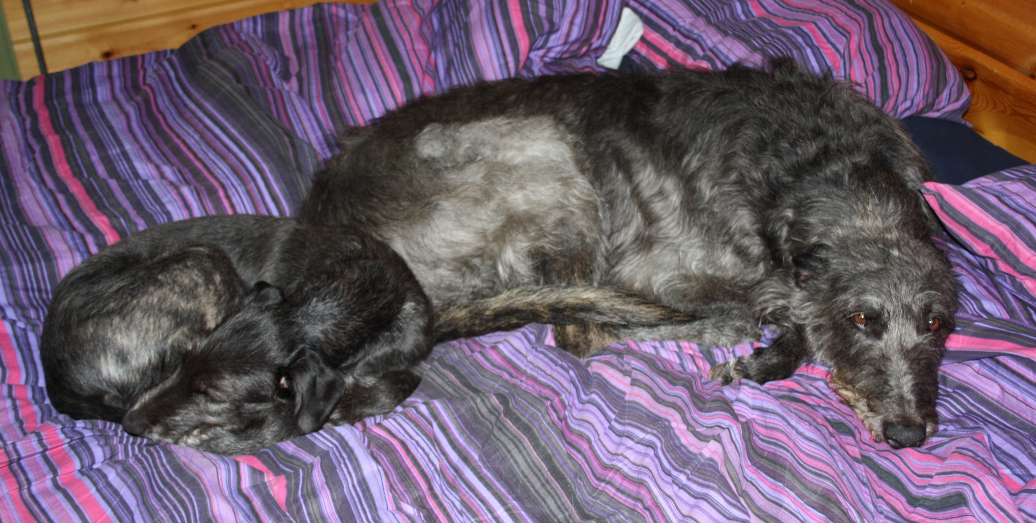 Ik had voor 5 dagen antibiotica meegekregen, dus woensdagavond kreeg hij z’n laatste tablet. Donderdag zag de wond er nog prachtig uit, niet dik, niet rood. Maar in de loop van de vrijdagmiddag begonnen er zich rode plekken te vormen en zag het gehechte stuk er wat opgezwollen uit. Al die tijd heeft Calhoun geen verhoging gehad, 37,8 was het hoogste! Maar nu was het 38,8 en ik maakte me grote zorgen. Ik heb toen natuurlijk gelijk nieuwe antibiotica gehaald maar die nacht was Calhoun erg onrustig en zijn temperatuur was opgelopen tot 39 graden. Bij een Deerhound dus echt niet goed. Het leek ook wel of hij bang was in het donker en hij sliep dus weer bij ons op bed. Zaterdag toch maar weer even naar de dierenarts en deze heeft Calhoun een pijnstillende injectie gegeven en zei dat ik de Tramadol (pijnstiller) wel iets kon verhogen. Eenmaal thuis werd, na verloop van tijd, Calhoun rustig. Zeer rustig, hij leek wel gedrogeerd! Veel trek in eten had hij niet, die avond, ondanks het blikj