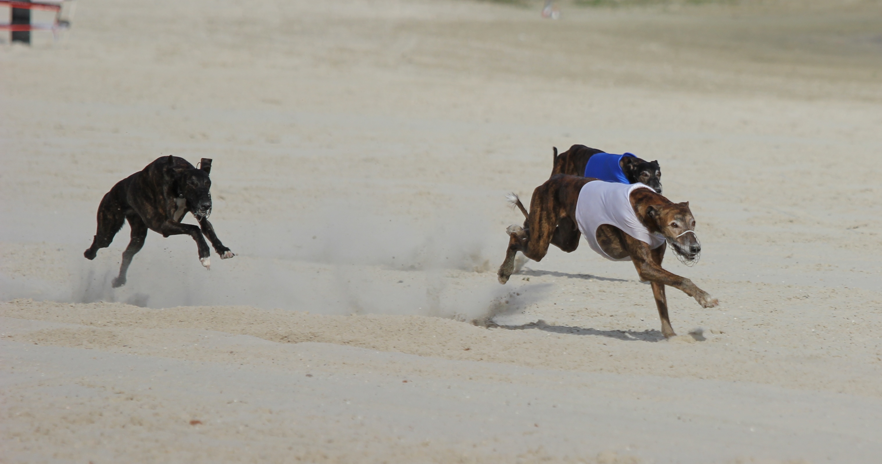 Het mooie van de mop was dat het parcours dat deze vereniging had uitgezet op het rechter gedeelte van het strand, echt gevaarlijk was. Het haas werd tussen een vaststaand houten/metalen zitje en een dikke boom door getrokken. Als er twee hounds hier gelijktijdig tussendoor zouden lopen en elkaar per ongeluk zouden aanstoten, zou één van beide zich aanzienlijk kunnen blesseren. Dit parcours moest dus zaterdagochtend eerst aangepast worden.