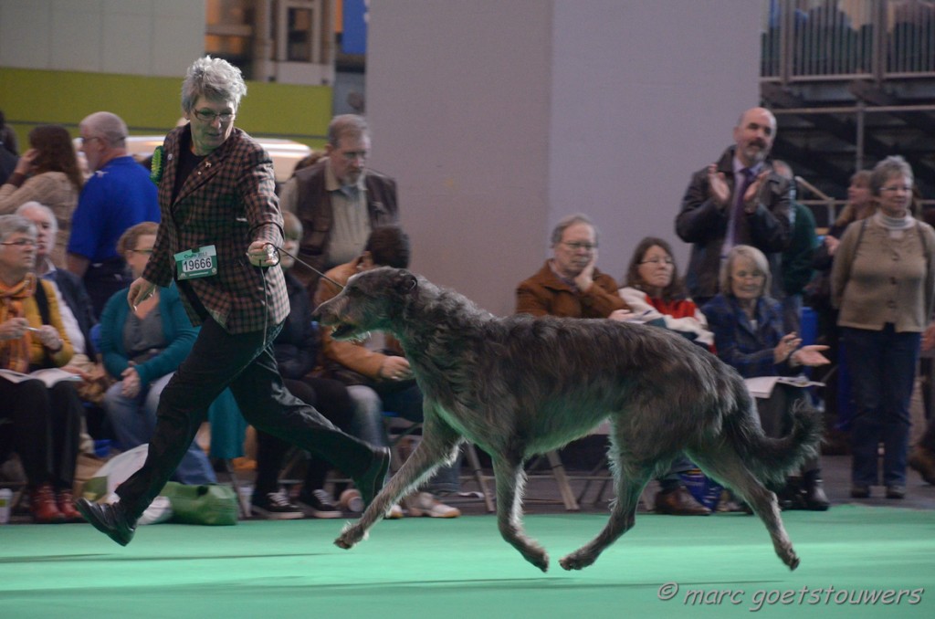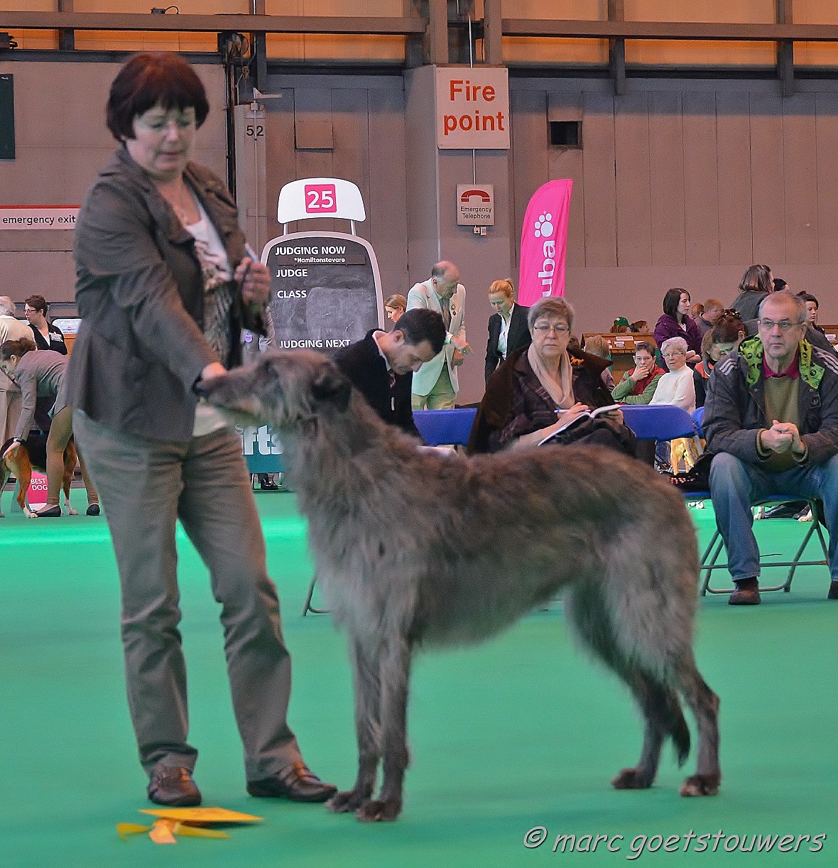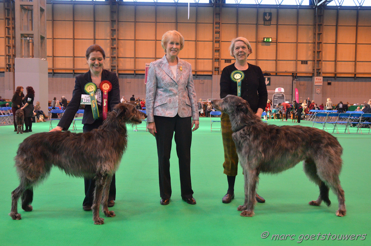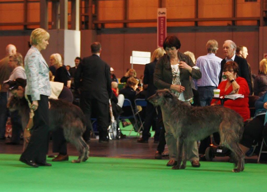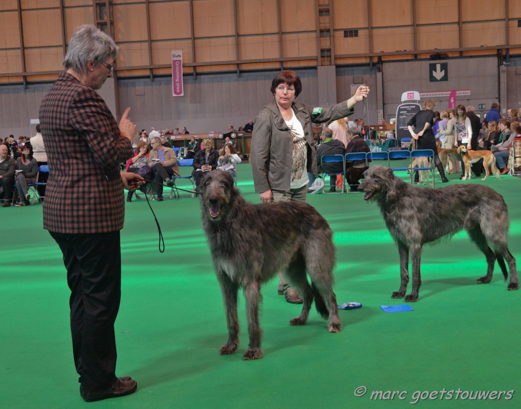 Zondagochtend vroeg uit de veren, hounds verzorgen en snel richting Birmingham. Voordat de Deerhounds aan de beurt zijn worden er Finse Spitsen in dezelfde ring gekeurd. Dit geeft ons mooi de tijd om nog even met die en gene te praten en ons goed voor te bereiden. Cscarf en Calhoun zijn beiden in de Open Dog gemeld met een entry van 11. Het is een sterke klas met verschillende Engelse Kampioenen erin. Vooraf hadden we besloten dat Sonja Cscarf zou voorbrengen, haar beenlengte past beter bij de snelheid die Cscarf ontwikkelt en zodoende konden zowel Betina als ik van Cscarf genieten terwijl hij zijn fantastische gangwerk toonde.