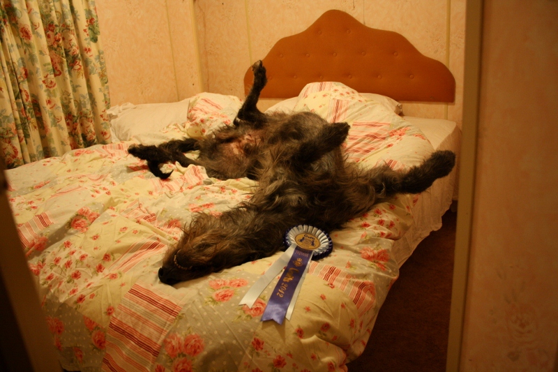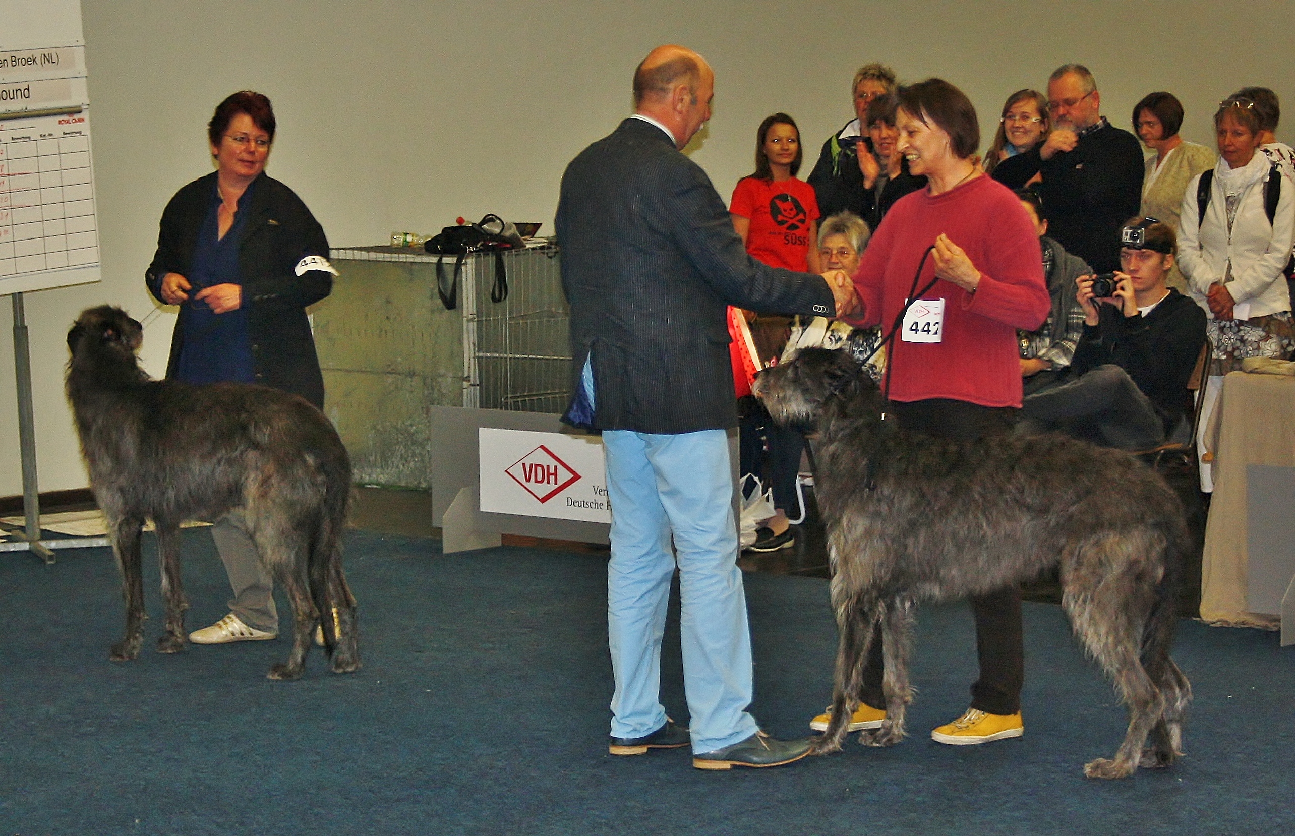 Op donderdag 10 mei vertrek ik met Calhoun naar Dortmund alwaar op vrijdag de Nationale show en op zondag de Europasieger plaatsvindt. Tijdens de Nationale is het ook mogelijk om een Engels CC te bemachtigen dus dat is wel interessant. Sonja en Angelika zijn ook onderweg naar ons vaste overnachtingsplekje op een paar kilometer afstand van de Westfalenhallen. Hier verblijven we de laatste jaren regelmatig, het is er goed toeven en zeer dicht bij een heerlijk groot park met ernaast gelegen dierentuin, heerlijke wandelingen en hertjes kijken is vaste prik. Vrijdagochtend moeten we vroeg opstaan want om 9.00 uur begint Jill Peak (UK) aan de keuring van de Deerhounds. 4 Reuen en 3 teven zijn gemeld en aanwezig. Het wordt ons al gauw duidelijk dat deze keurmeester niet naar de standaard keurt, met name betreffende het gangwerk heeft ze een zeer vreemde smaak. Uiteindelijk wint de reu met het meest steppende en losse gangwerk en de beste teef vertoont een vergelijkbaar gangwerk. Calhoun en een teefje uit de tussenklas krijgen een ZG, de rest een U. Cheytah (Gebruikshondenklas) krijgt 1U en het CAC en Xena (Kampioensklas), van Angelika krijgt het CAC
