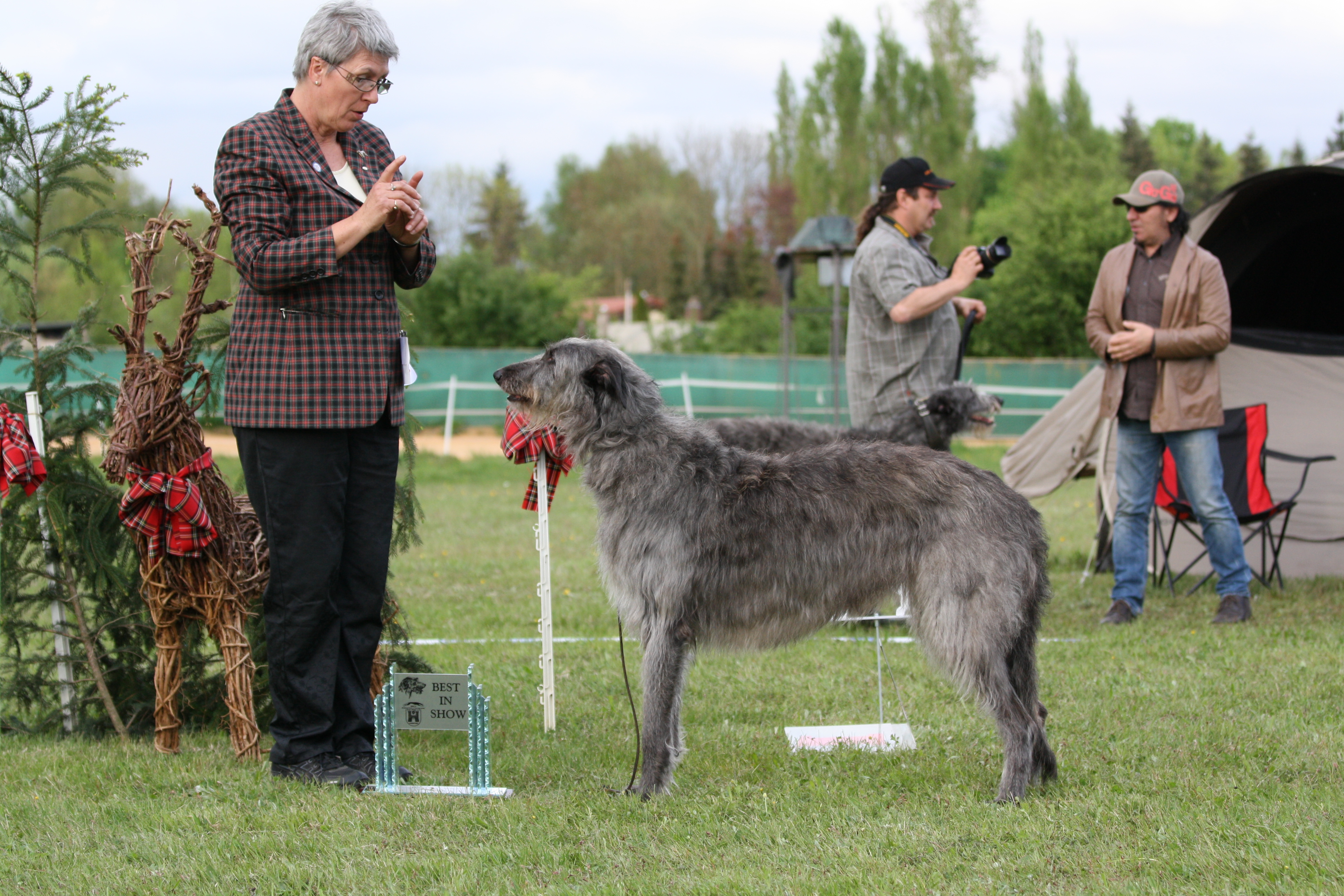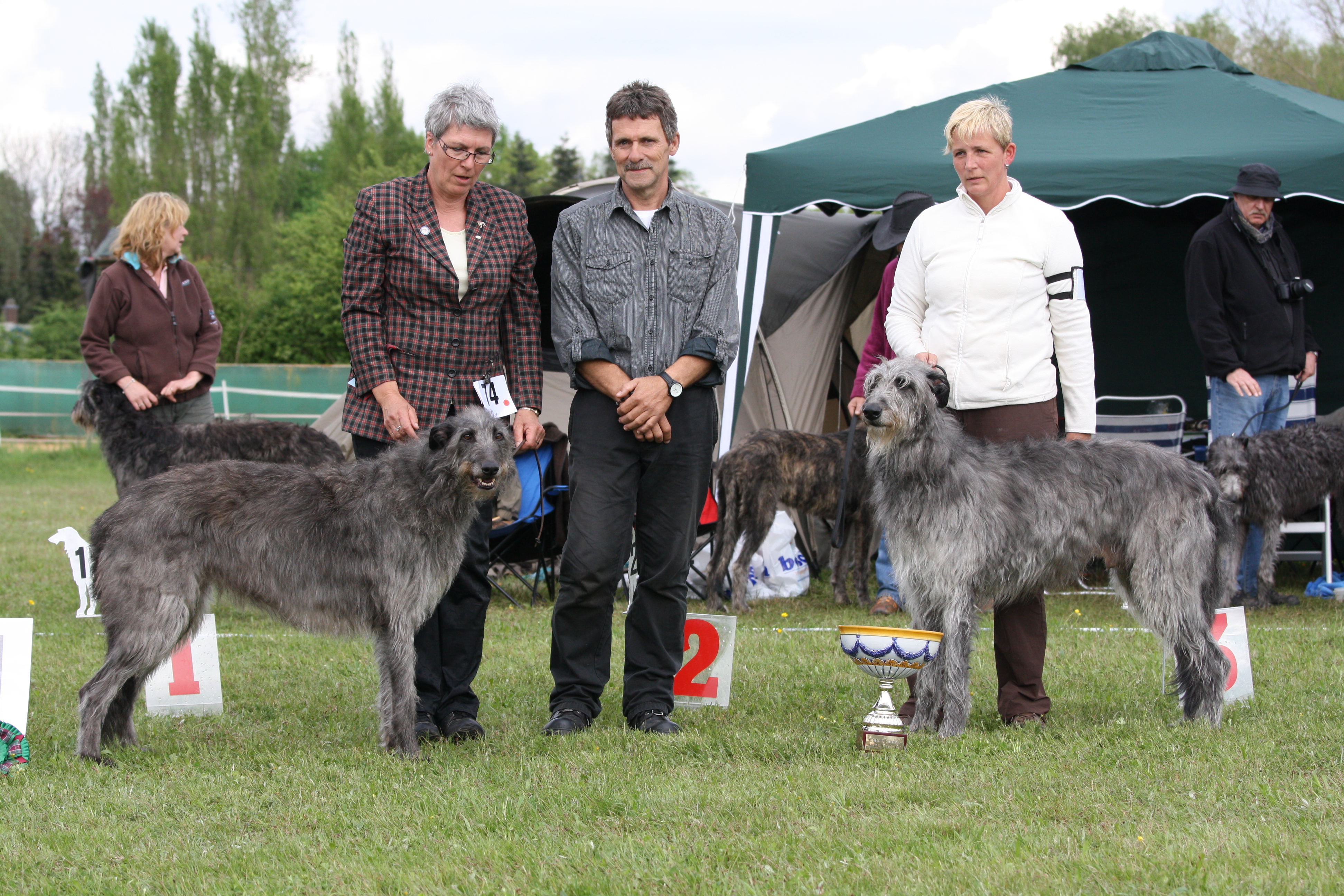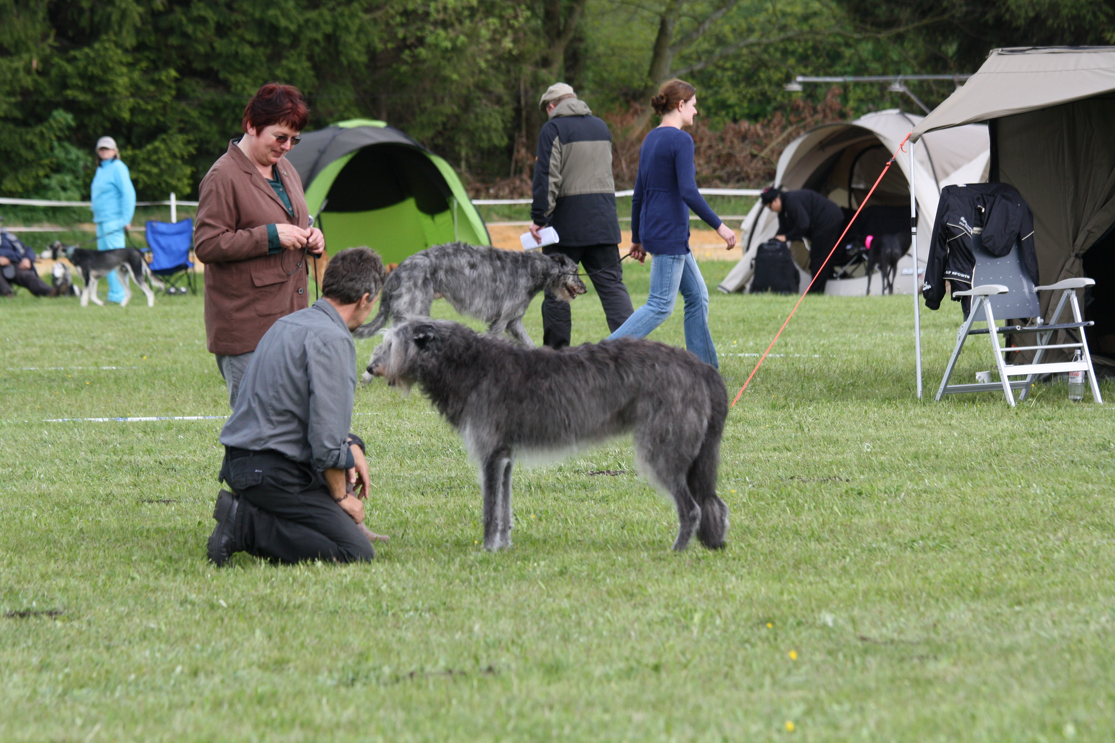 Op 5 mei was de Deerhound Jahresausstellung te Landstuhl met de dag erna een Nationale Coursing. Voor de Jahresausstellung waren 94 Deerhounds gemeld; 30 reuen (2 absent) , 60 teven (3 absent) en 4 pupjes van 4 maanden. Onze keurmeester was Josef Das van de ‘Easy Runner’ Ierse Wolfshonden en Deerhounds uit België.