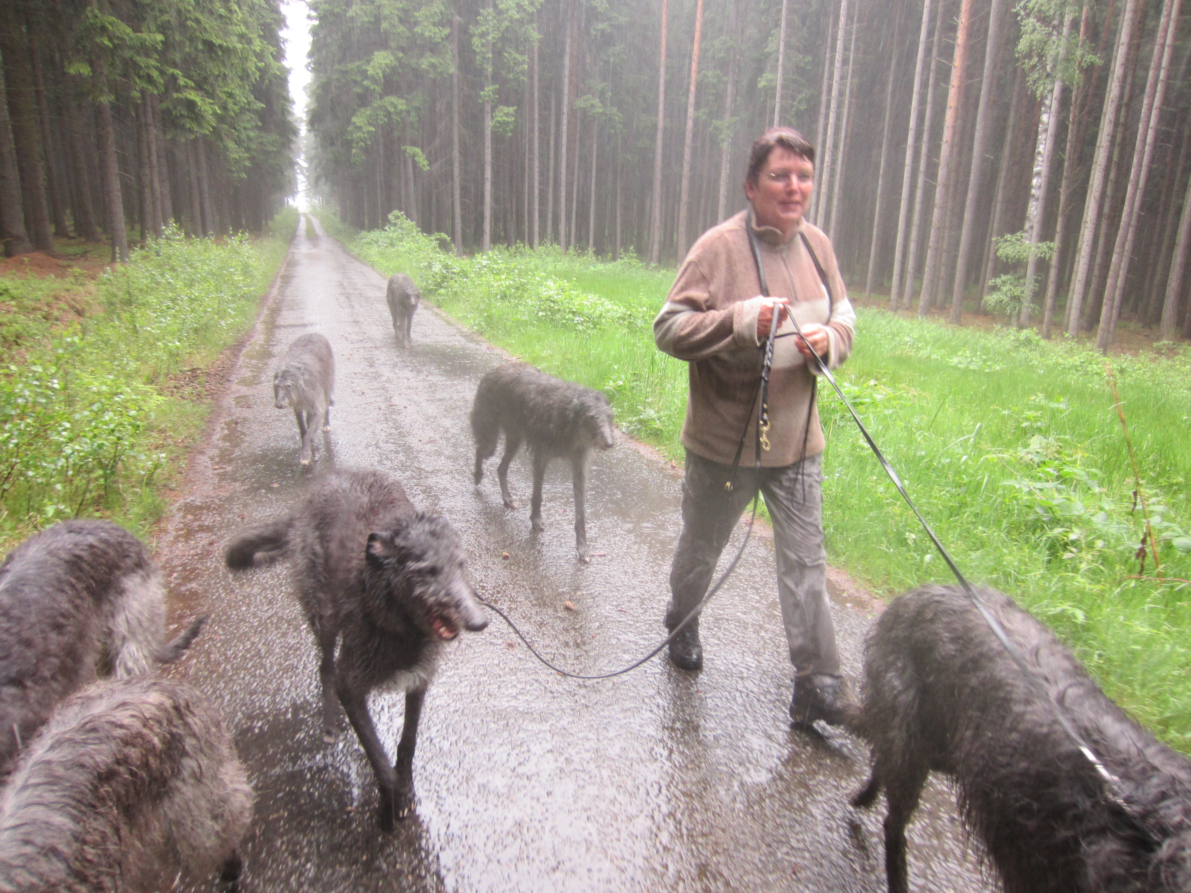 Zoals verwacht is Caintha vanaf de eerste ochtend al aan het piepen en hoe vaak we het haar ook zeggen dat ze niet mag lopen, ze blijft het doen. Vooral zondagochtend, als de Deerhounds aan de beurt zijn, heeft ze het moeilijk.