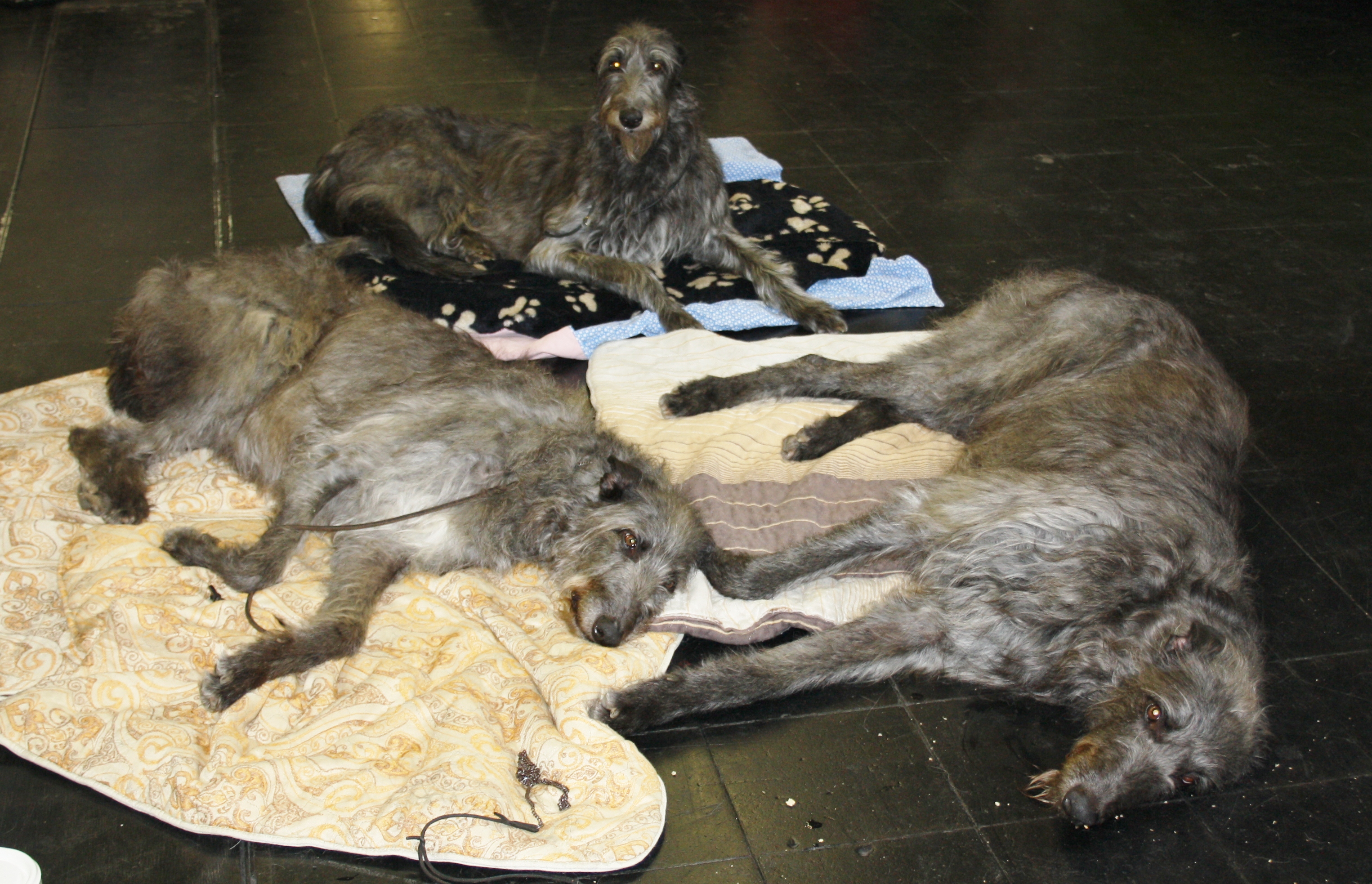 De vrijdagochtend vertrekken we op tijd richting de hallen maar op twee kilometer afstand belanden we in de file. De tijd tikt voorbij maar voortgang maken we nagenoeg niet. Langzaam slaat de paniek toe, om 10.00 uur vangt Dr.Zilli Orietta uit Italië met de Deerhounds aan en het is al half tien geweest! Tijdens het af en toe twee meter naar voren rijden, haal ik mijn tas op wielen met showspullen uit een zijklep van de camper en gooi die in de camper om vervolgens dat er uit te halen dat ik nodig heb om met Calhoun en Cheytah binnen te komen en te kunnen showen. Intussen wordt Sonja gebeld door Eva Petzold die een zeer verontrustend telefoontje van Monika Rhein kreeg waarin deze mede deelde dat aan de andere kant van de weg ongeveer 3 kilometer voor de afrit naar de hallen een vrachtwagen was omgevallen en dat de weg totaal versperd was. Monika staat hier vlak voor en kan geen kant op! Natuurlijk zijn er vele exposanten door dit ongeval zwaar gedupeerd, ook Monika en de Russin Lemyaskina met twee gemelde Deerhounds en zes Ierse Wolfshonden is niet op tijd in de hal. Het zou je maar gebeuren!!! Vreselijk!!! Ik denk dat ik uit de auto was gesprongen en gewoon was gaan lopen, de auto achterlatend. Read the rest of this entry »