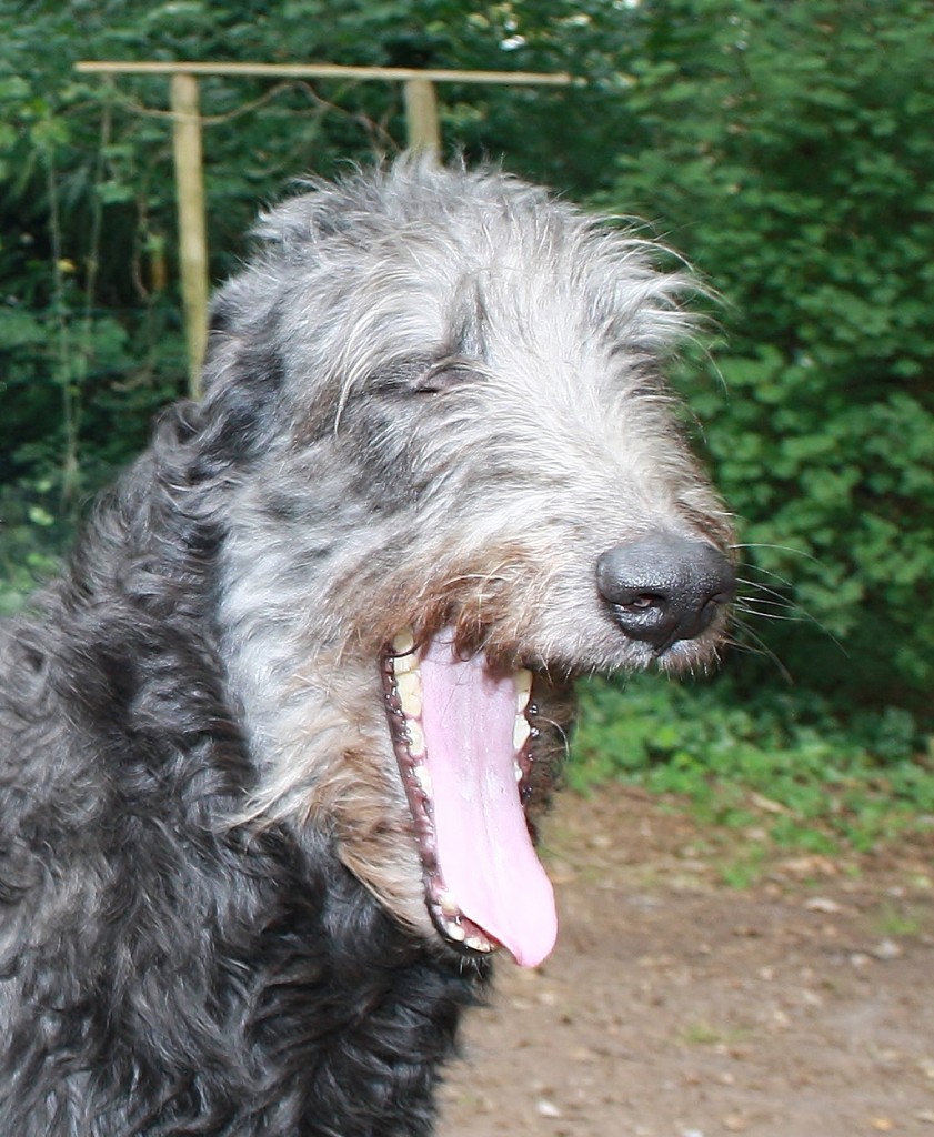 Een poosje terug liep ik met de hounds een rondje bos. Achter bij het maisveld aangekomen moesten de meiden, Caintha en Coney, even dakken door het 30 centimeter hoge mais. Ik vond dit niet zo’n goed plan en probeerde ze op het pad te krijgen. Goh, wat kunnen Deerhounds toch ongelooflijk slecht luisteren, eigenlijk helemaal niet, als ze plezier hebben. Onze achterbuurman was op zijn stukje grond aan het werk en kwam kijken wat er aan de hand was. Natuurlijk kwamen we tot een praatje en de meiden kwamen tot rust en stonden vast iets erg smerigs boven water (maisveld) te wroeten. Hun neuzen verdwenen steeds dieper in de bagger en hun poten werden steeds zwarter. Op een gegeven moment kwam Coney over het greppeltje en wilde de buurman wel begroeten, dit kon ik gelukkig voorkomen! Maar daar kwam een andere bosbewoner aan met Mo, een Dwerg Schnauzer. Na Mo te hebben begroet was natúúrlijk de eigenaar in zijn witte korte broek aan de beurt, dat kon ik niet voorkomen. Met een zeer enthousiaste zwaai van haar met bagger doordrenkte snoet, porde Coney haar neus in zijn kruis. “Niet doen, ik heb net een schone broek aan!” Met een zo strak mogelijk gezicht mompelde ik mijn excusses en zei dat ik de stomerij kosten wel zou betalen. In gedachten zag ik hem al ’s middags met zijn vrouw (ook zo’n modepoppetje) door het centrum van Breda lopen terwijl hij vergeten zou zijn om een schone broek aan te trekken.