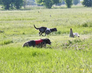 Inmiddels was Simon gevraagd om ook te jureren tijdens de twee daagse coursing. Hij had vrijdag het parcours al uitgezet en zaterdag de tijd gehad om het uit te proberen en nog het een en ander aan te passen. Hij zou zondag en maandag gedeeltelijk draaien en jureren. Van een rustig weekend was dus geen sprake! Helaas waren alleen Cheytah en Calhoun gemeld voor de coursing, geen andere Deerhounds. Ze liepen op maandag. Simon zou Calhoun starten en wederom startte Calhoun als een speer. Hij behaalde zelfs een paar puntjes meer dan Cheytah. Maar helaas, ’s middags bleef hij in eerste instantie weer staan en pas toen ik vanaf de zijkant “ LOPEN!” riep, ging hij van start en liep hij zelfs nog beter dan ’s morgens! Wat gaat er toch in dat koppie om? Enfin, bij de prijsuitreiking kreeg Cheytah de prijs voor Schonheit und Leistung en werd natuurlijk eerste van de twee.