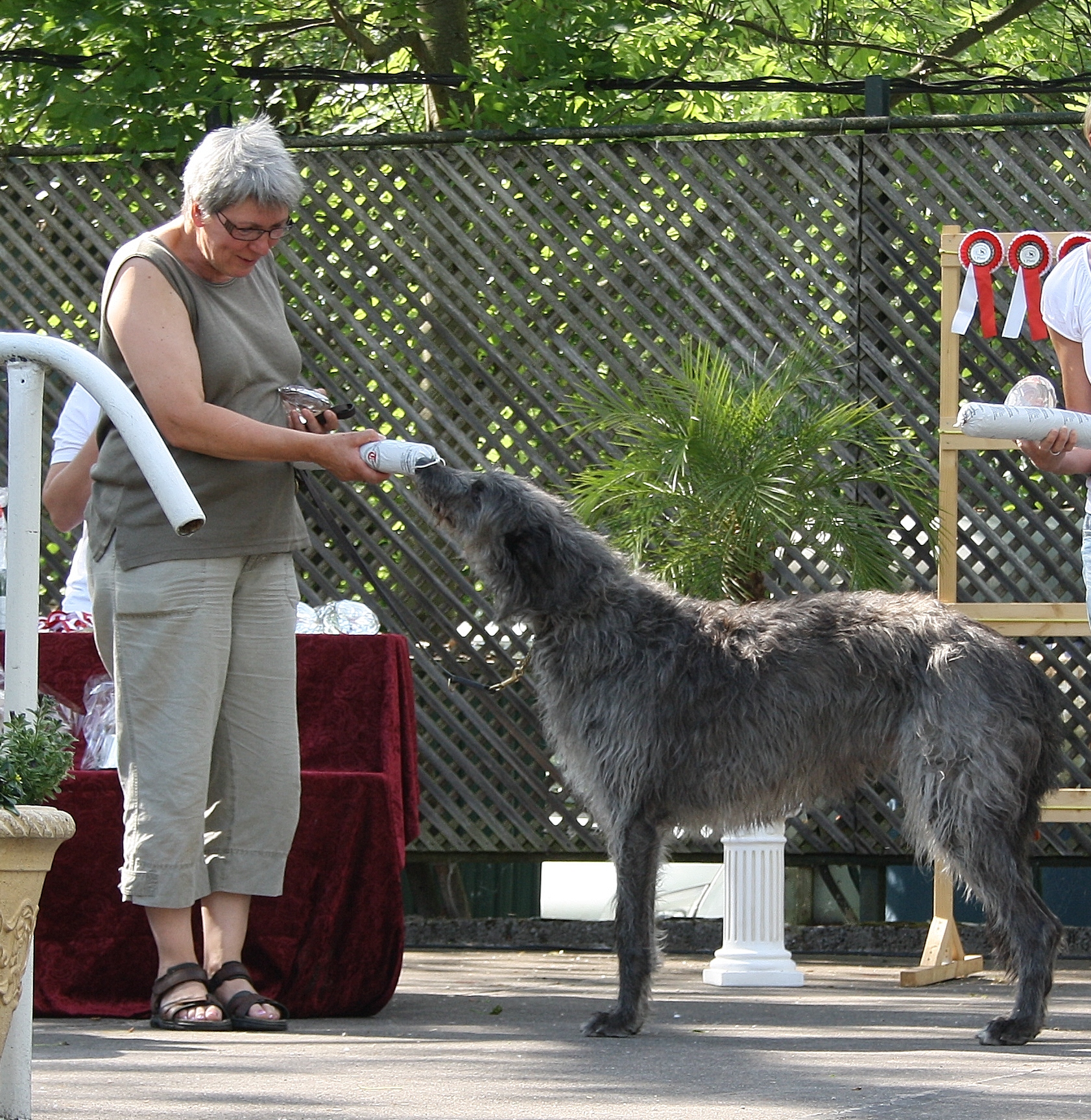 Zondagmiddag 20 mei ben ik weer thuis en begint de voorbereiding voor drie weken caravannen met daarin een lang weekend Tüttleben en vervolgens het EKC in Hongarije. Na in een record tempo de was te hebben gedaan, hounds hebben laten enten, de caravan te hebben in gepakt, de kippen goed verzorgt en de planten water te hebben gegeven vertrekken we woensdagmiddag 23 mei richting Tüttleben. We overnachten in Dortmund op ons vaste plekje. Donderdagmorgen rijden we verder. Na een paar uur worden we gebeld door Katja Pfanmuller, de voorzitter van Windhondenrenvereniging Tüttleben, PANIEK, de keurmeester die was uitgenodigd om op zaterdag de show te keuren en zondag en maandag de coursing te beoordelen, was ziek geworden en kon niet komen. Of ik wilde/kon keuren. Natuurlijk wilde ik dat wel doen, je laat zo’n vereniging niet in de steek, ik had alleen de standaarden en de meetlat niet bij me maar de standaarden kon Sonja nog wel thuis uitdrukken en meenemen en een meetlat zou wel te regelen zijn. Gelukkig had ik de hele vrijdag de tijd om de standaarden nog eens goed door te nemen want juist de aspecifieke kenmerken zijn natuurlijk uitermate belangrijk. Ik had zaterdag 15 Afghanen, 10 Ierse Wolfshonden, 12 Greyhounds, 2 Chart Polski’s en 32 Whippets te keuren, wel vond ik het erg jammer dat er geen Magyar Agar gemeld was. Bij de Afghanen kreeg ik een reu die zo van een plaatje uit een oud boek was gelopen, echt het oude type! Prachtig! Bij de Ieren had ik twee veteranen dames waarvan de oudste met negen en een half jaar nog uitermate fit was. Deze maakte ik later die dag ook BIS Veteraan. Daar ik Calhoun ook voor deze show gemeld had, moest Sonja hem showen. Hij werd BOB en kon dus niet in de erering verschijnen daar ik ook de groepskeuring mocht verrichten. Gelukkig had de keurmeester van de Italiaanse Windhondjes die hier hun Jahresausstellung hadden, mevrouw Isabel Bänziger uit Zwitserland, een prachtig Isabel kleurig Italiaantje met een perfect gangwerkje tot BOB gemaakt en kon ik deze dan ook met een gerust hart BIS maken.